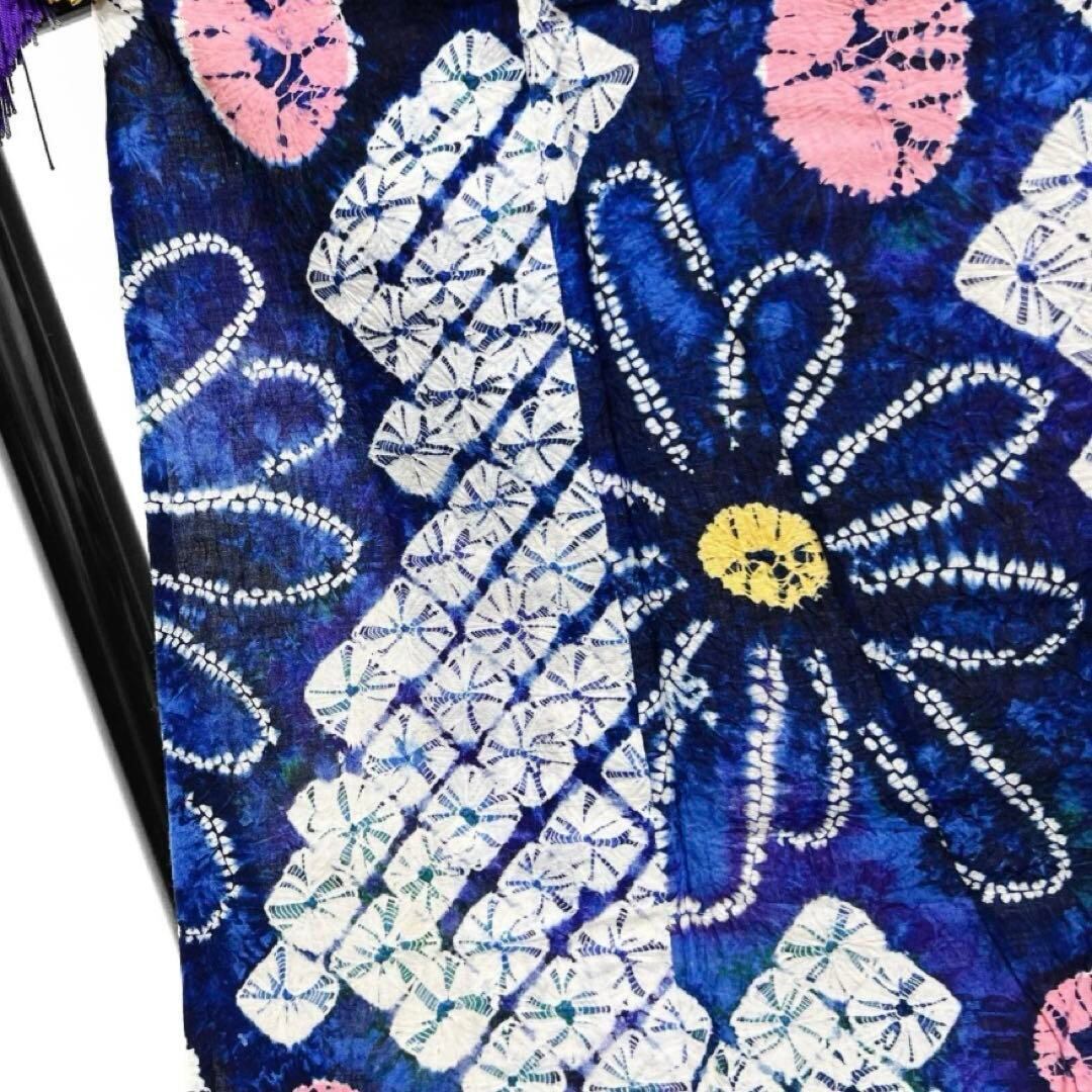 藍染のブルーを基調として少しグリーンを混ぜたグラデーションの地に有松鳴海絞りで描かれた大ぶりの花模様がお洒落なデザインの一着です。