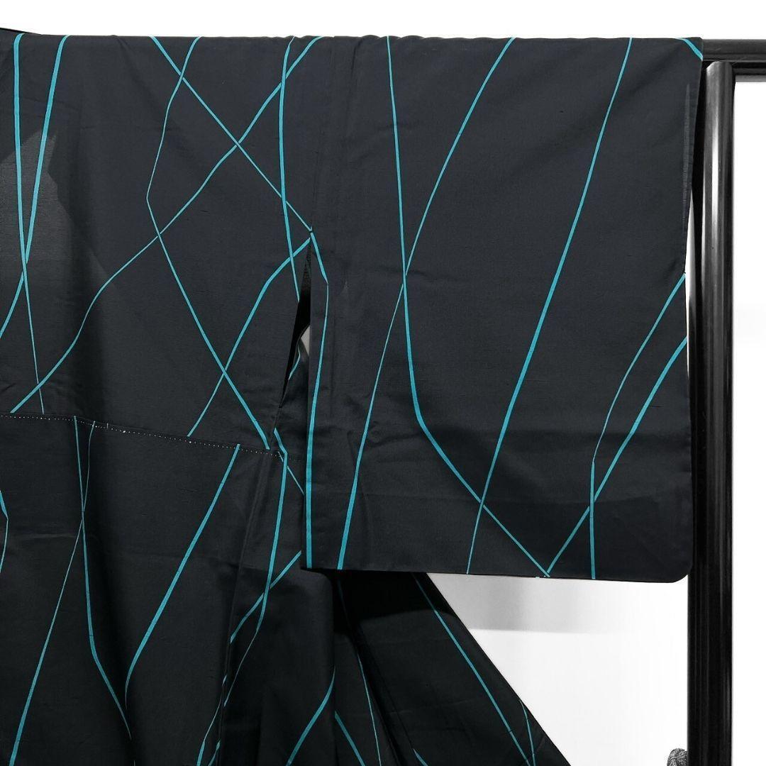 夏用 牛首紬 黒地 ターコイズブルー 流線 小紋 着物 035a p