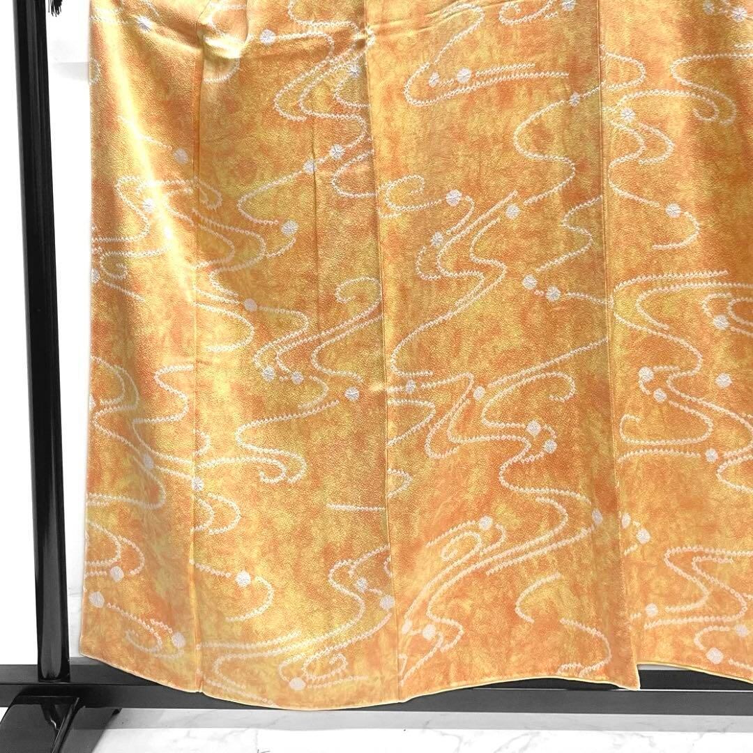 グラデーションの地に絞りで描かれた流水とドットの文様がお洒落な雰囲気の一着です。