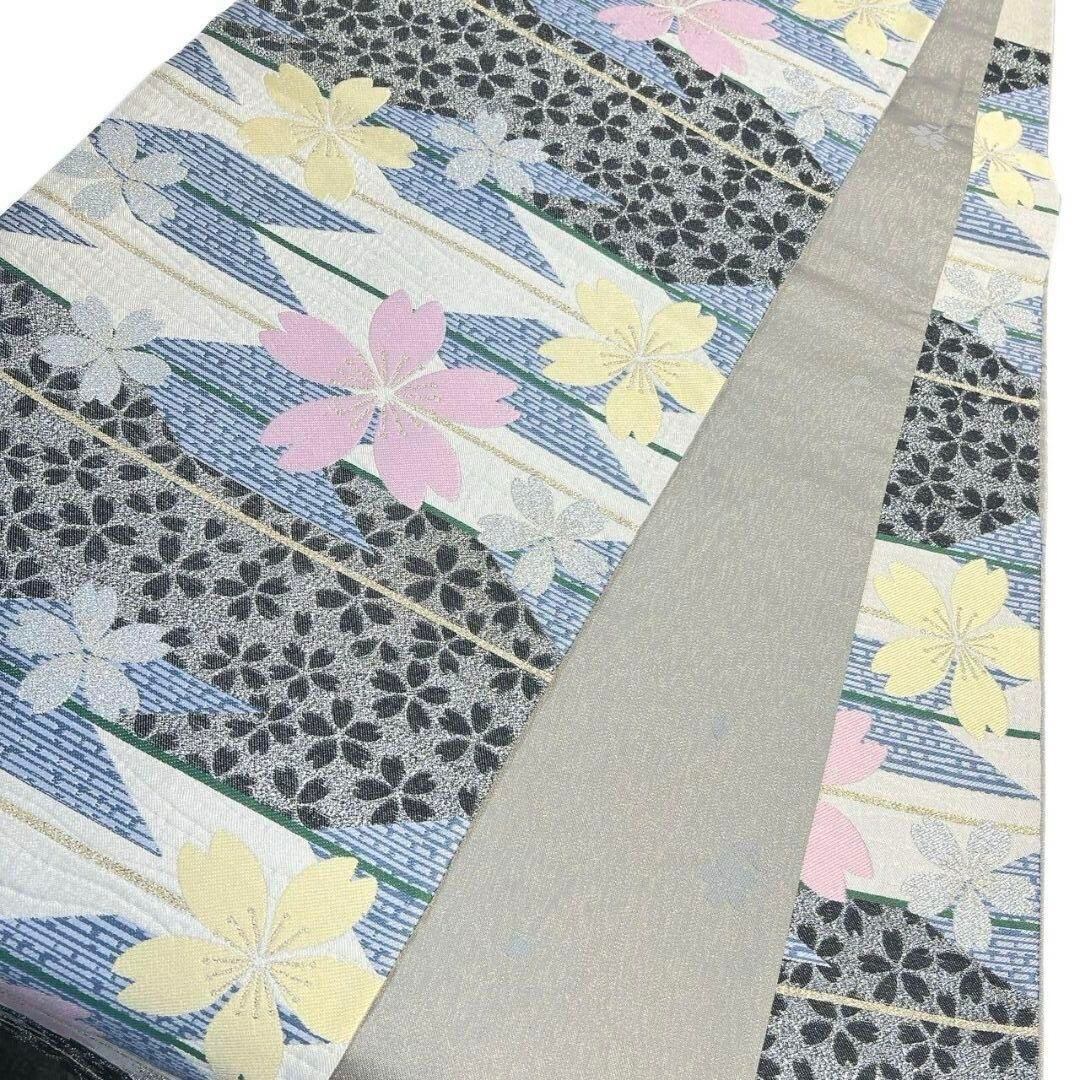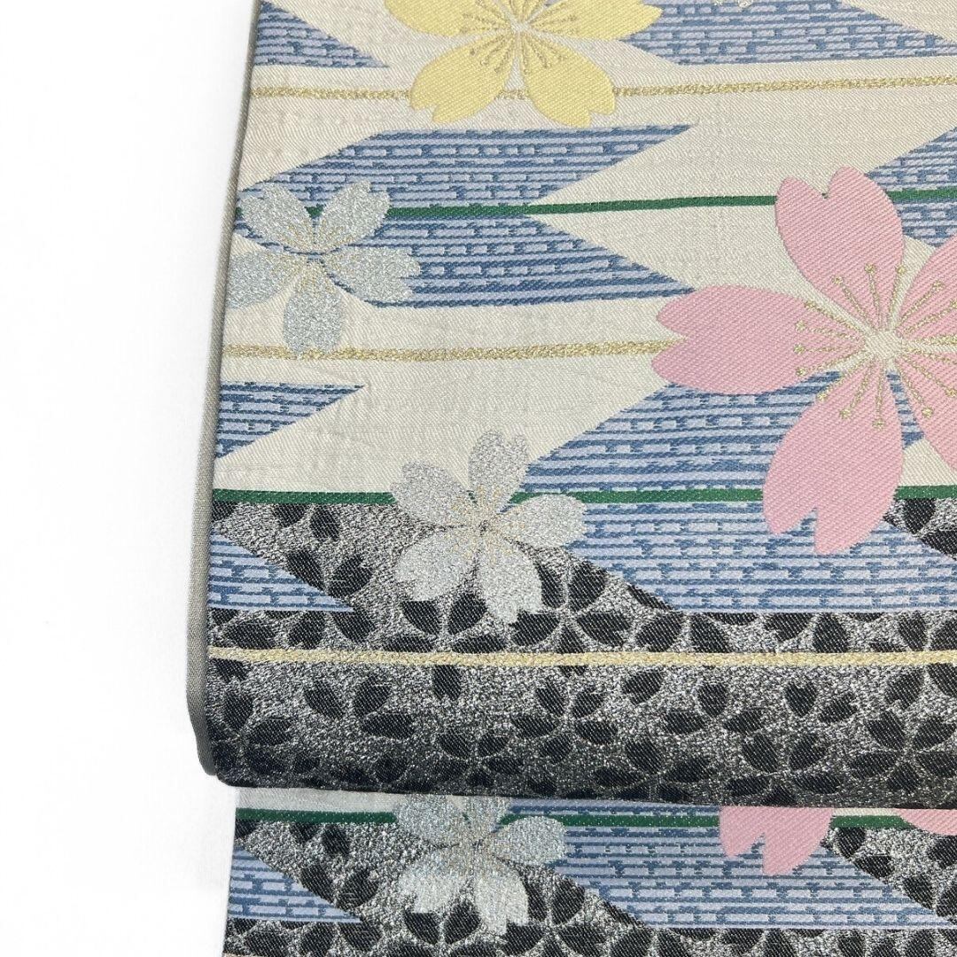 矢羽や桜花模様が横縞に銀糸や金糸を交え織り出された袋帯です。