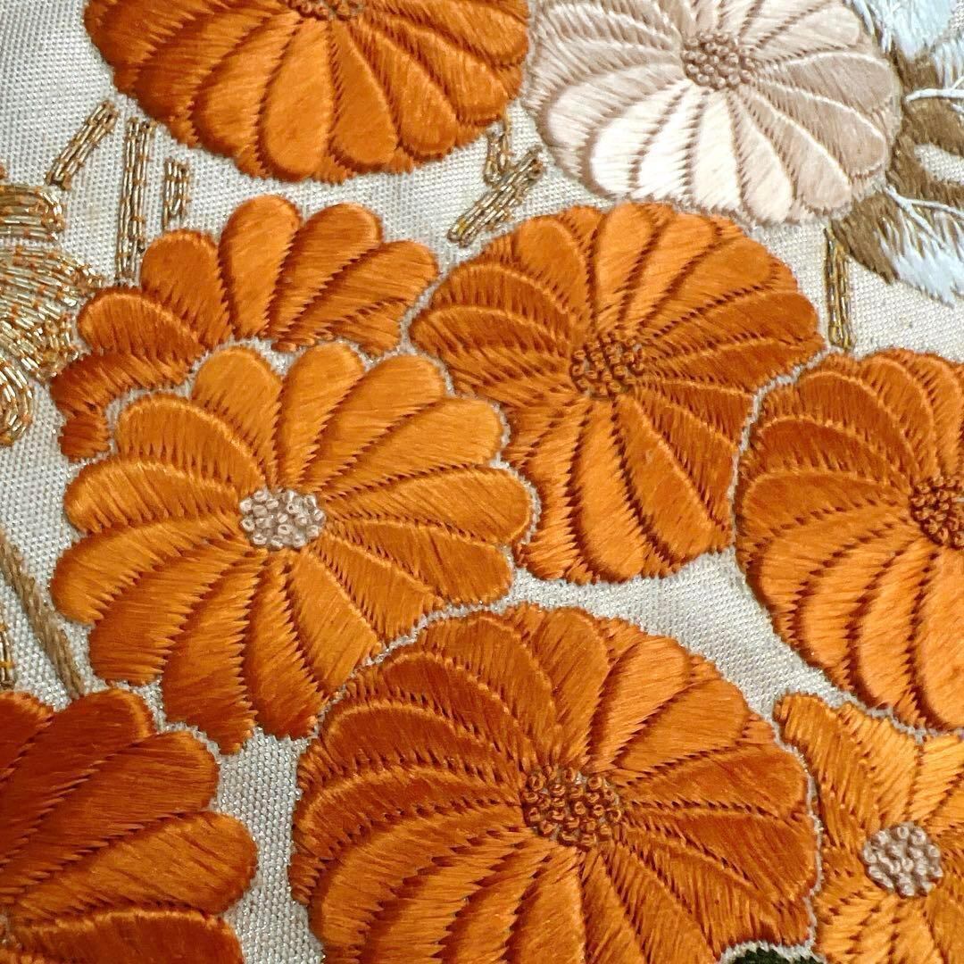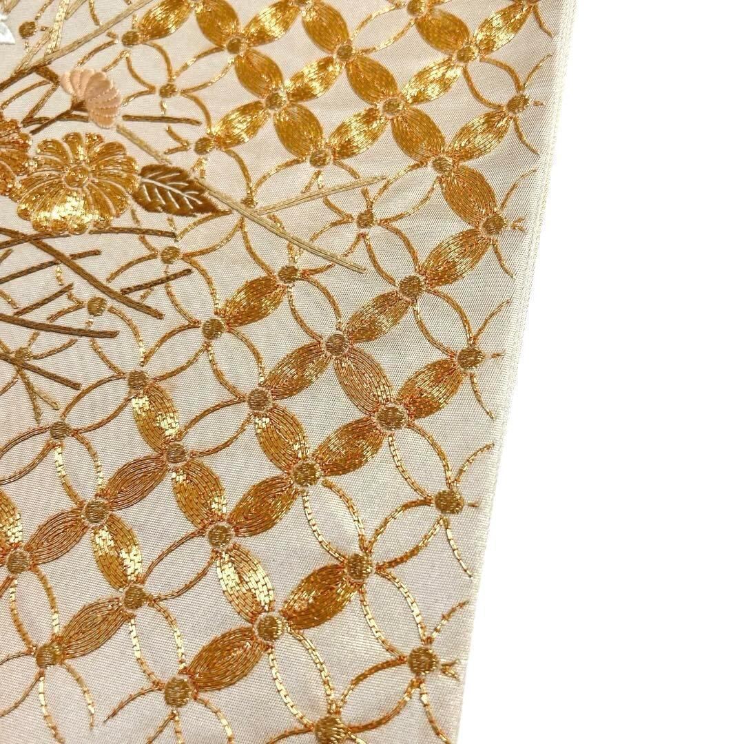 薄い光沢のあるベージュ地に金駒刺繍と刺繍で織られた菊花や楓、七宝の文様が華やかな一着です。