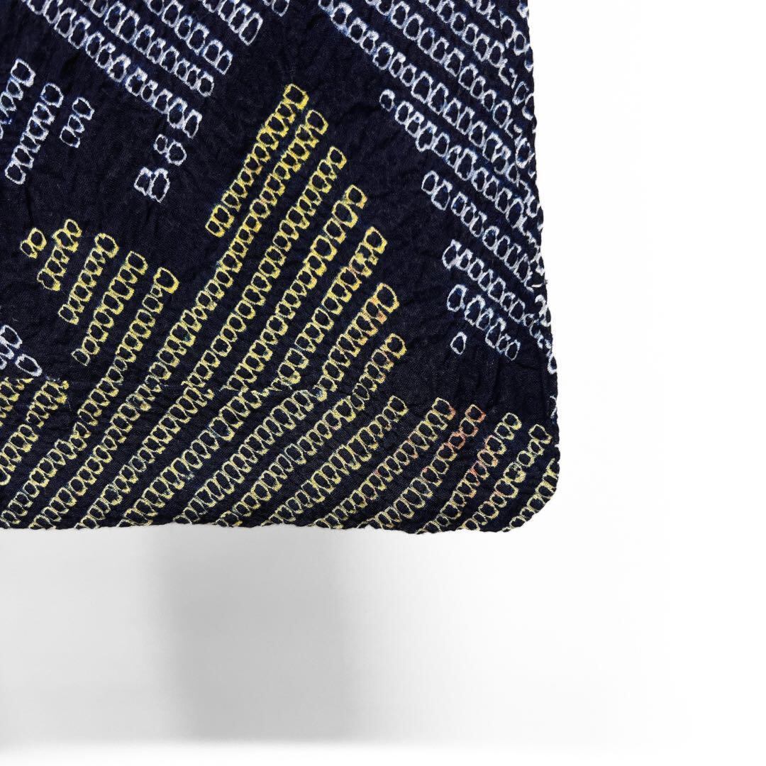 藍染のネイビーの地に有松鳴海絞りで描かれたイエローやピンクの楓の文様がお洒落なデザインの一着です。