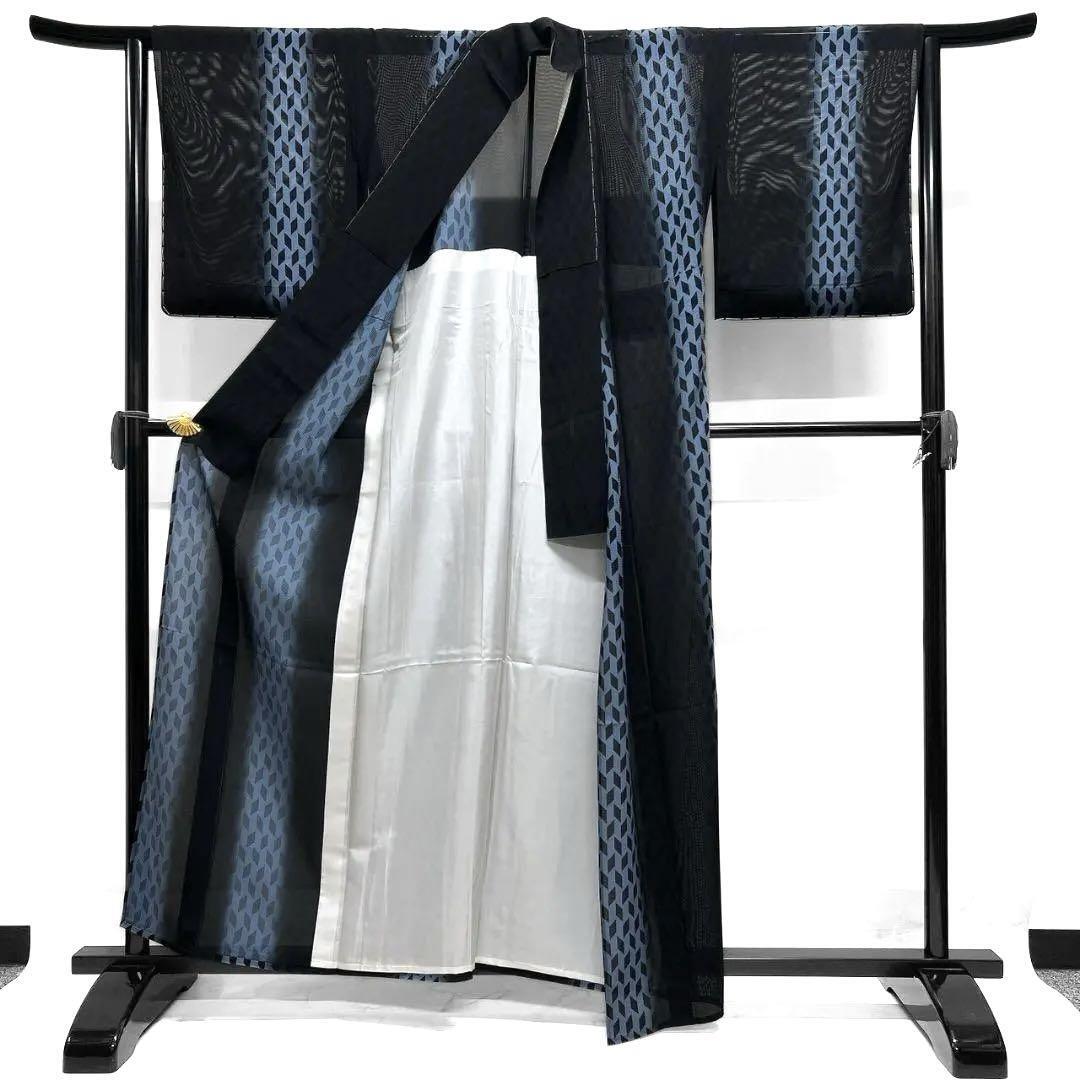 変わり菱模様が黒とくすみブルーでデザインされた縦縞の1着です。