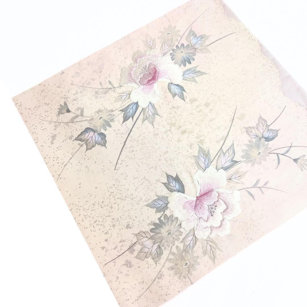 薄ピンク色地に牡丹が刺繍された開き名古屋帯です。