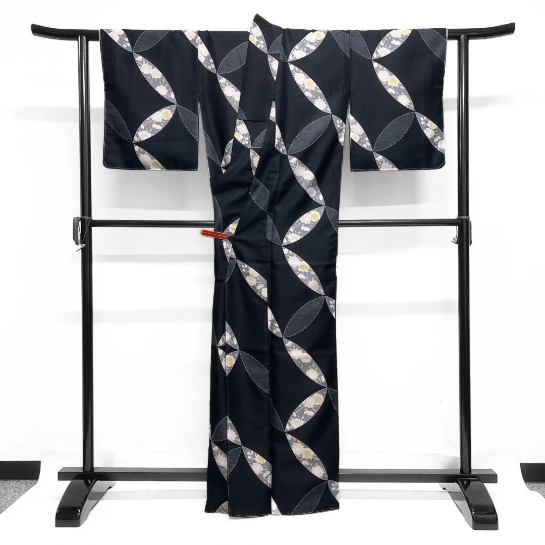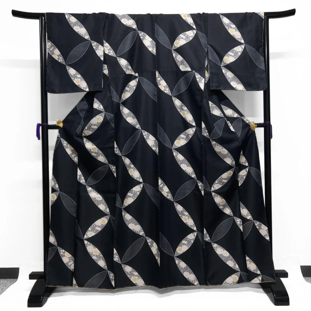 黒地に映える変わり七宝のような文様に描かれた花模様と縞模様がお洒落なデザインの一着です。