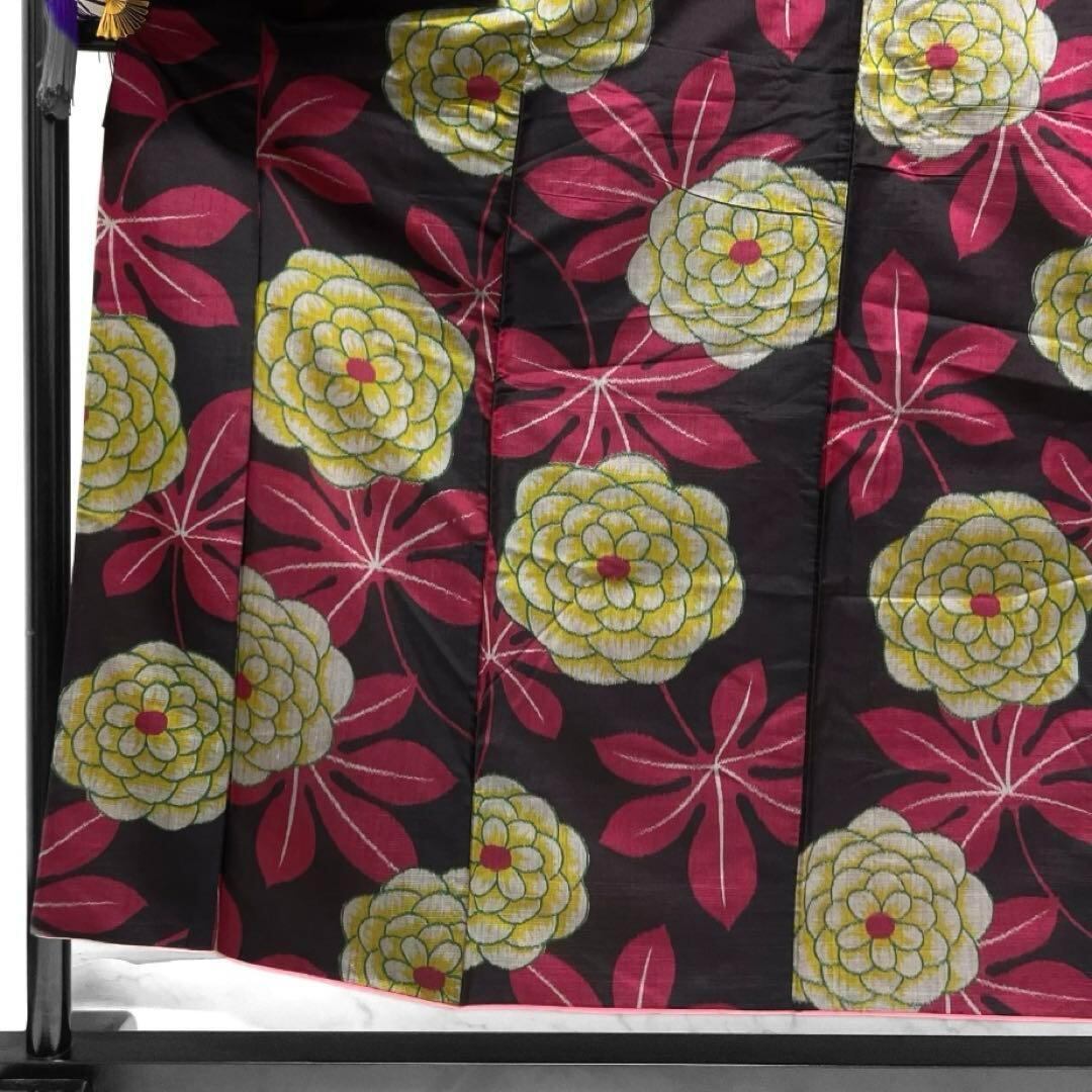 黒地に銘仙で織られた大ぶりの菊の花が目を惹くお洒落なデザインの一着です。