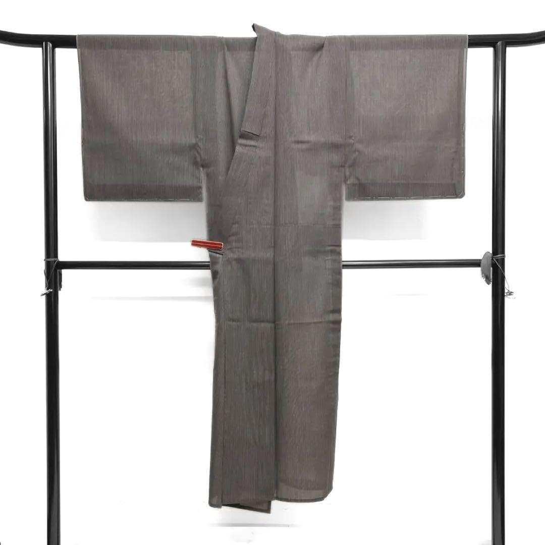 薄いチャコールグレーの紗の地に細やかなに描かれた縦縞の文様がお洒落なデザインの一着です。