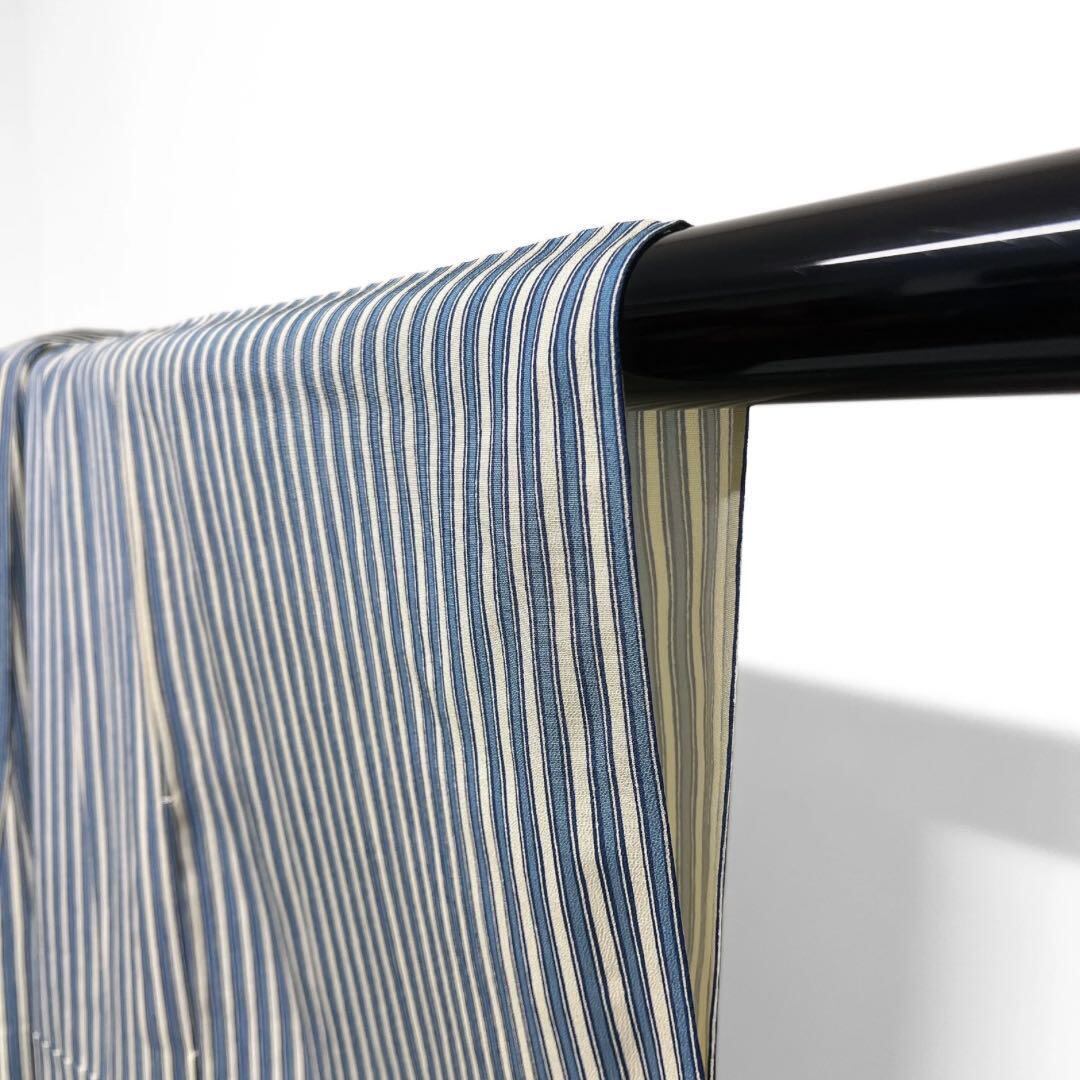 白地にブルーとくすみのライトブルーの縦縞の文様がお洒落なデザインの一着です。