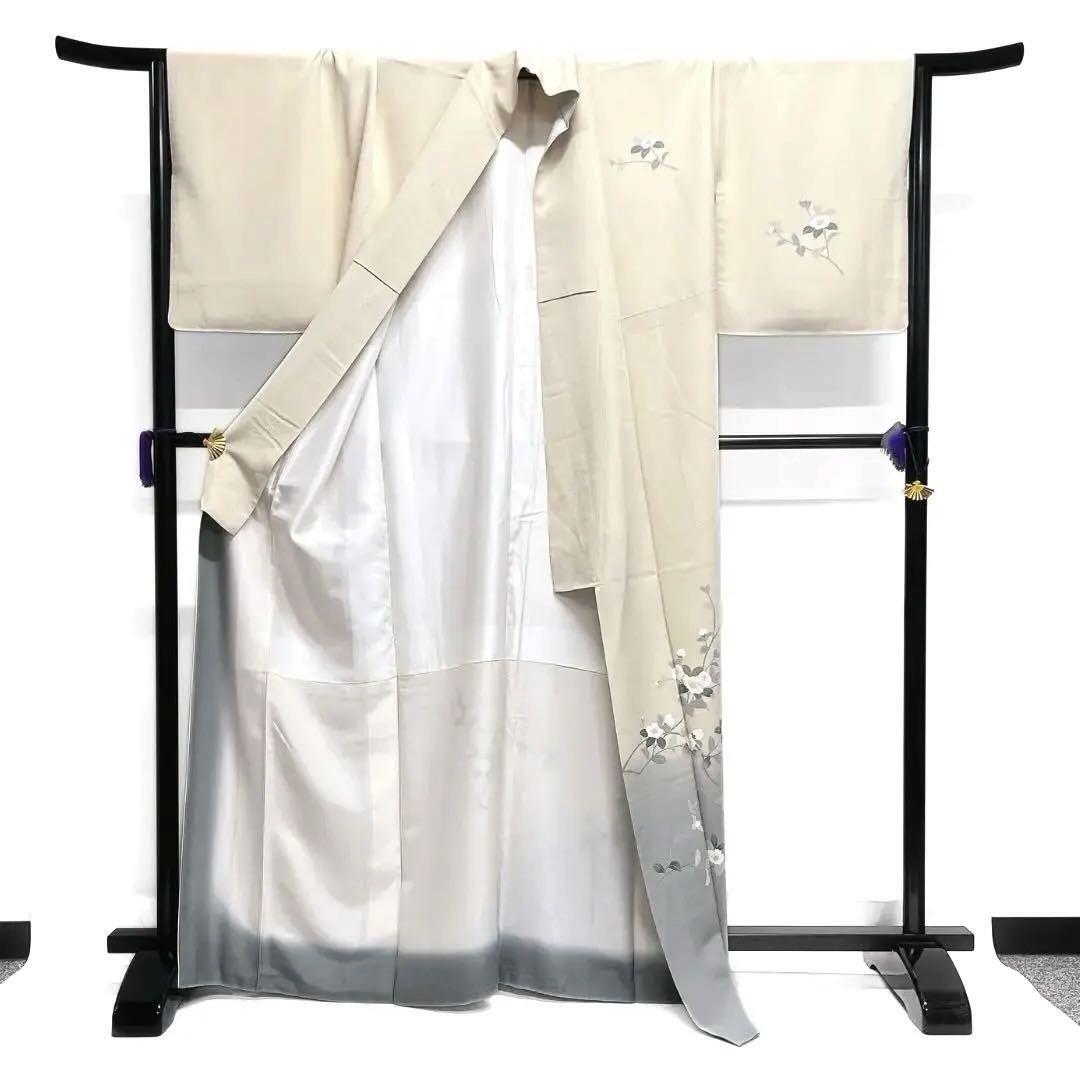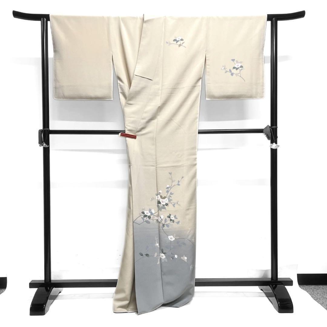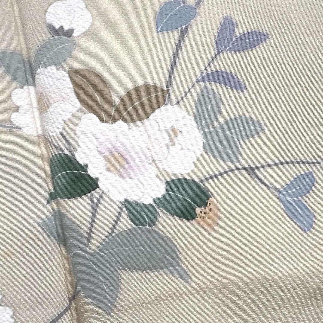 薄いくすみのクリームの地に京加賀友禅で描かれた椿の花模様が華やかなデザインの一着です。