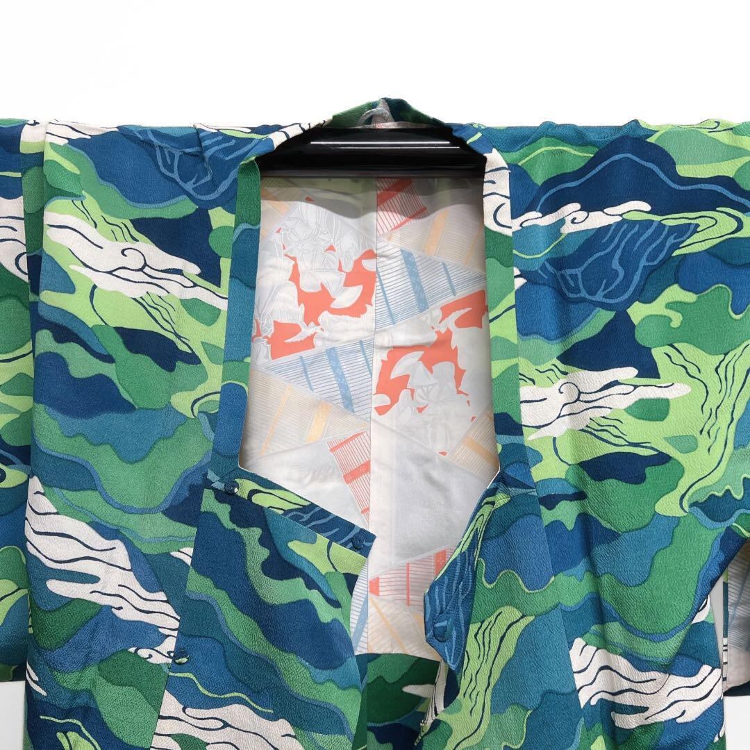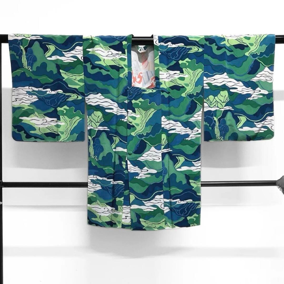 グリーンとブルーで描かれた遠山と雲の文様がお洒落なデザインの一着です。