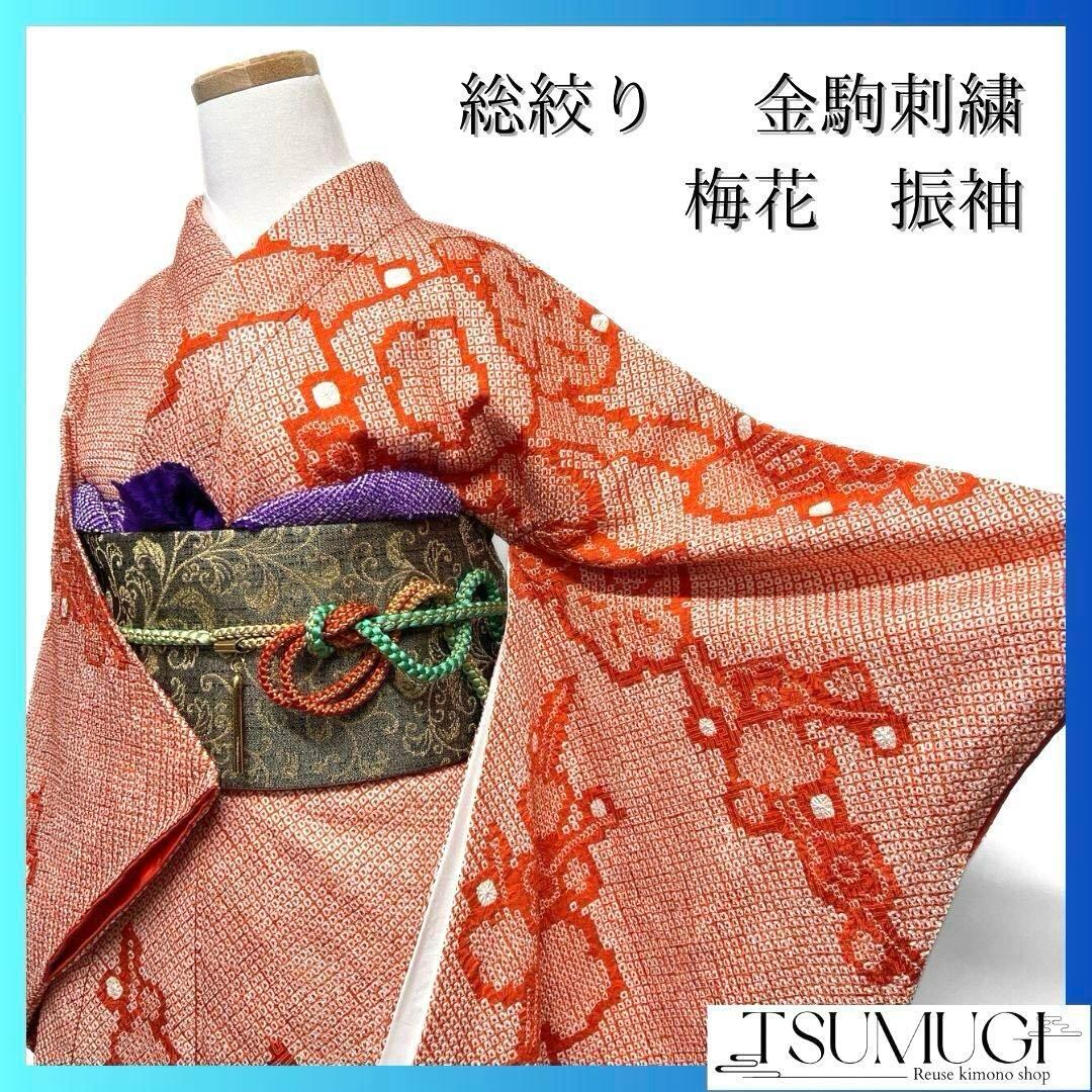 総絞りに金駒刺繍があしらわれた梅花模様の振袖です。