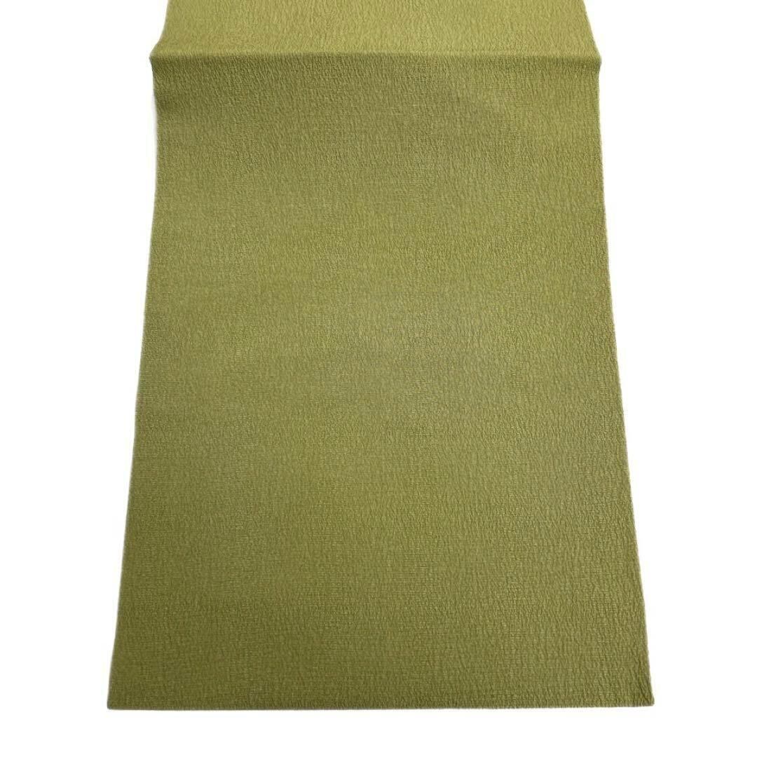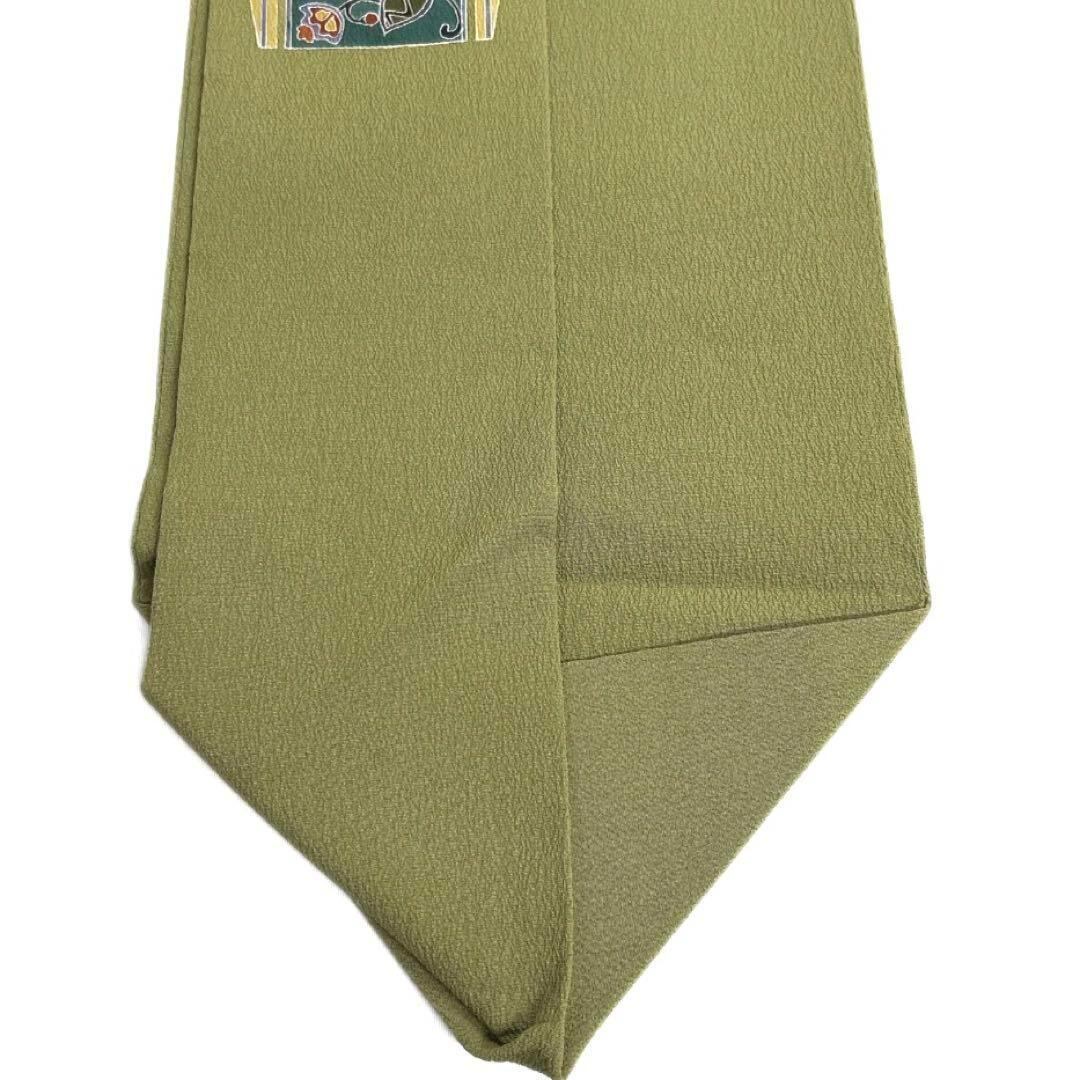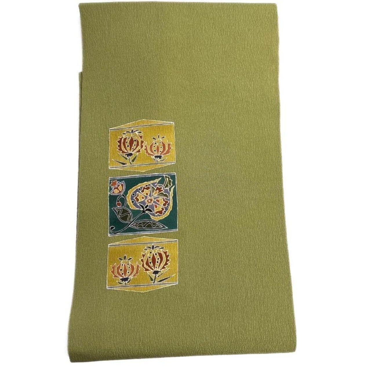 くすみグリーンの地に金彩を交えて描かれた抽象的な唐花模様がお洒落なデザインの一着です。