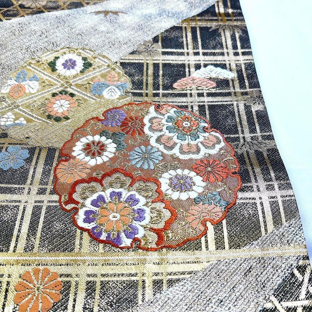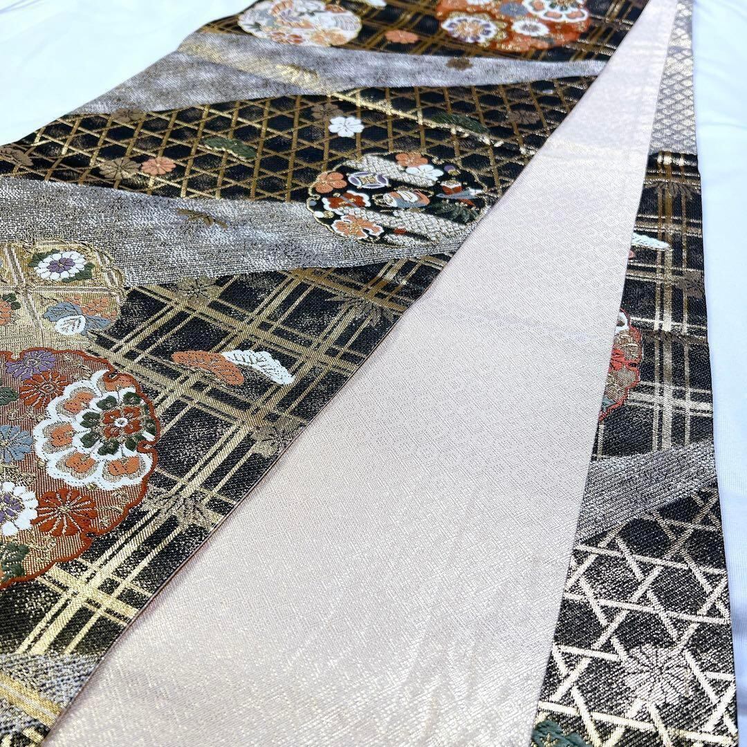 黒地に金色を基調として織られた松竹梅、雪輪模様、変わり格子が非常に華やかなデザインの1着です。