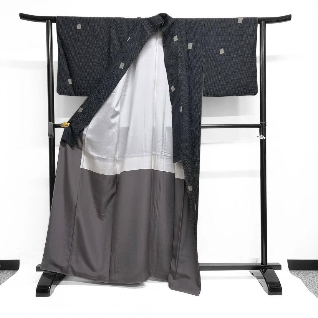 十字絣が織られた黒に近い深いグレーの地に色紙に鹿の子の文様が描かれたお洒落なデザインの一着です。