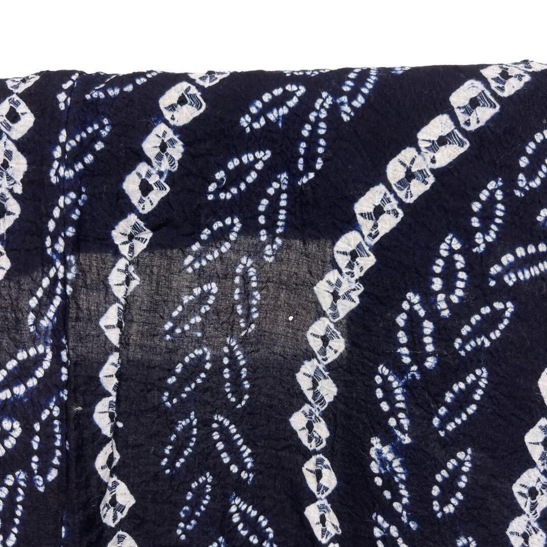 藍染のネイビーの地に有松鳴海絞りで描かれた藤の文様と鹿の子によるよろけ縞の文様がお洒落なデザインの一着です。