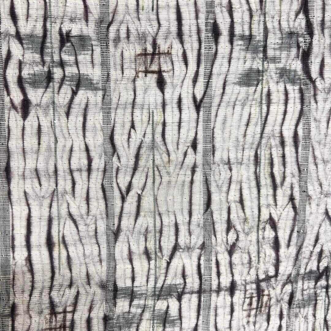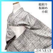 黒地に縦縞と板締めの総絞りに絣模様と花模様が描かれたお洒落なデザインの一着です。