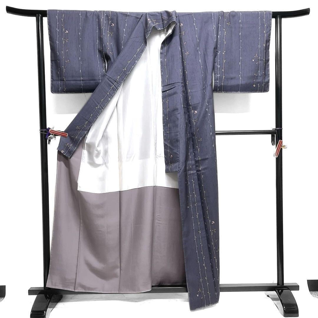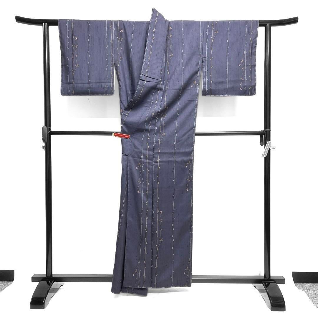 深いくすんだブルーの縦に節のある紬の地に蔦による縦縞とリーフに花模様がお洒落なデザインの一着です。