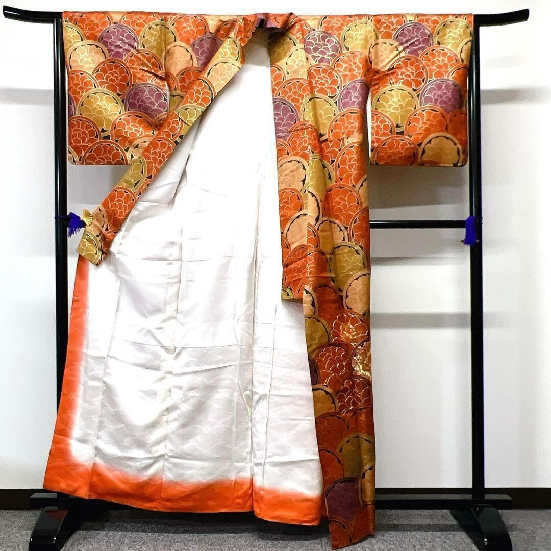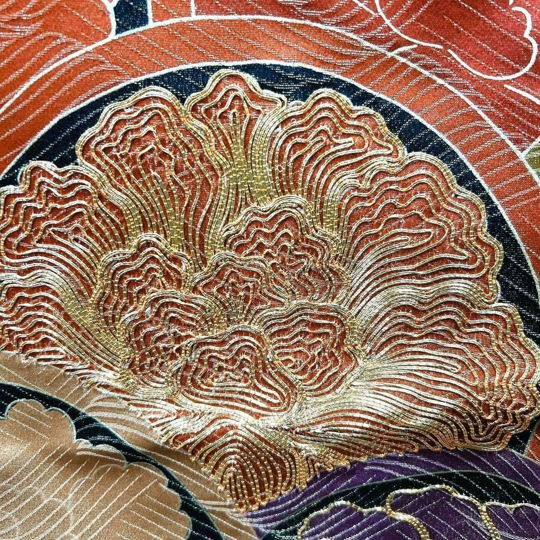 金通し地に金彩で縁取りした牡丹紋に金駒刺繍が織られた華やかで絢爛な一着です。