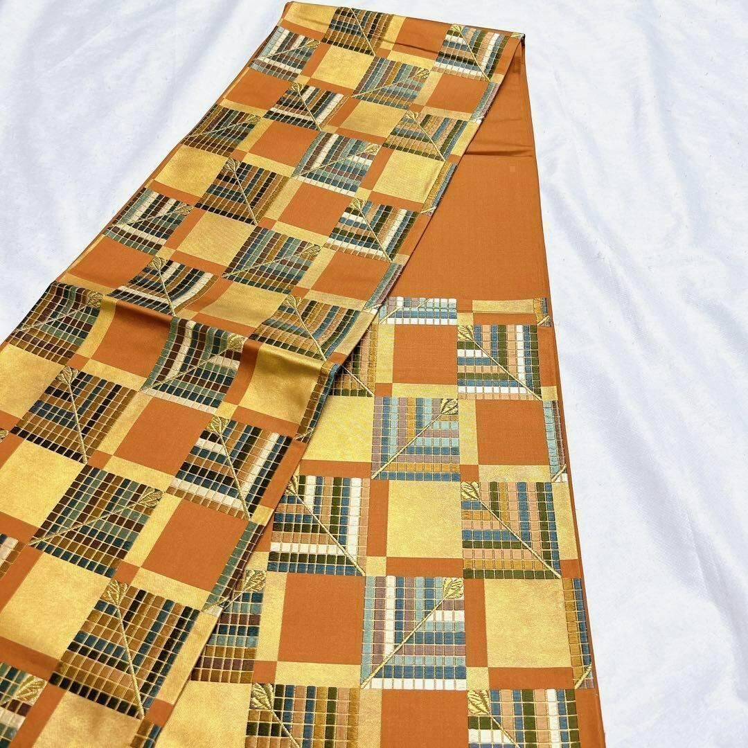 市松模様の上にタイル柄の刺繍の袋帯です。