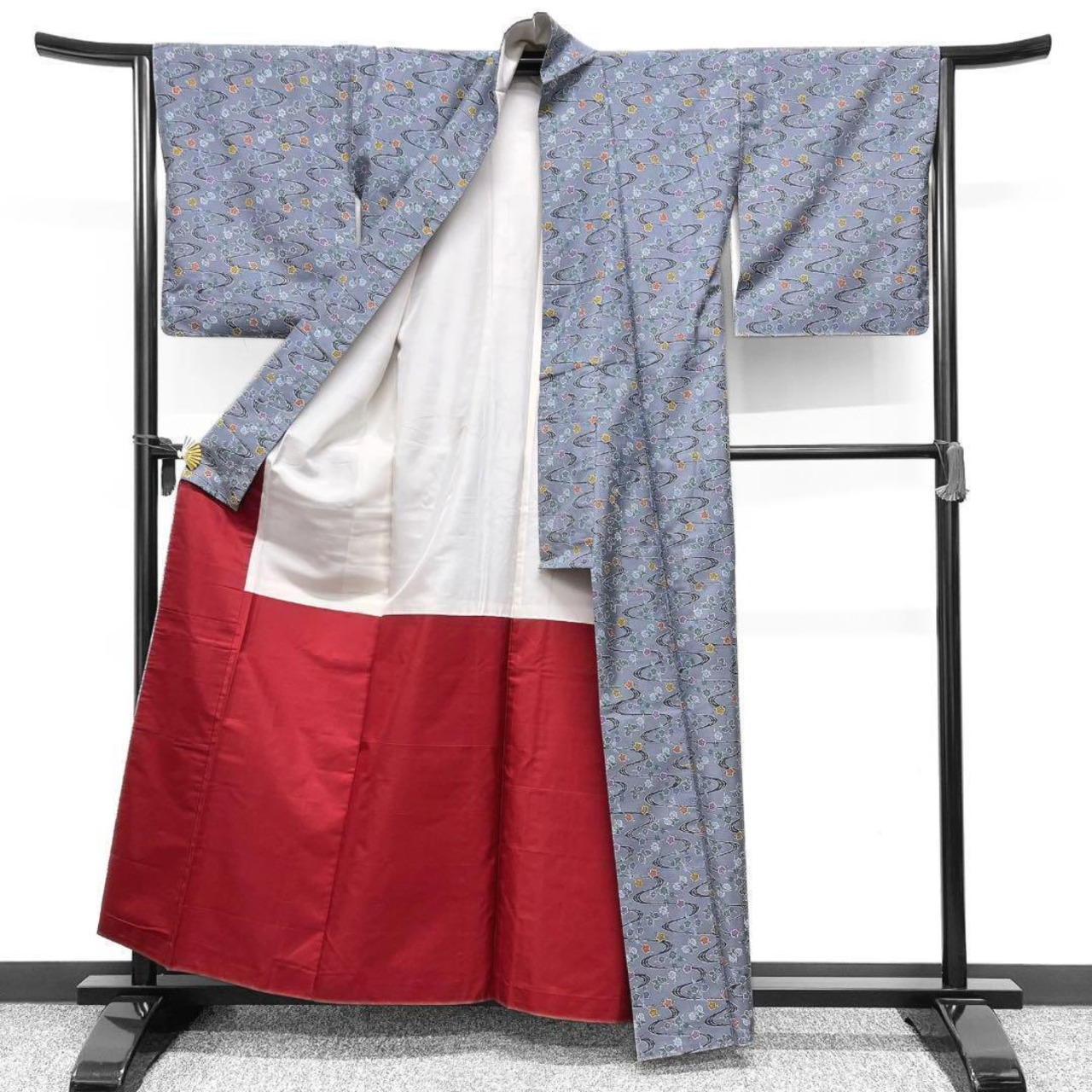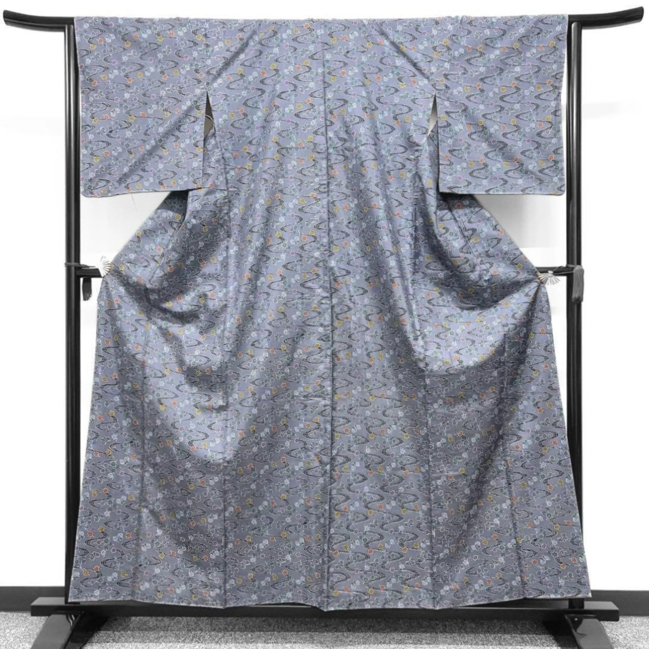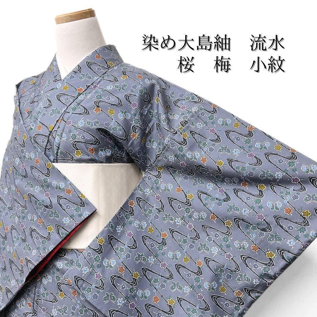 グレーの染め大島紬に流水に蝶とカラフルな桜や梅に小花の文様が映えるお洒落な一着です。
