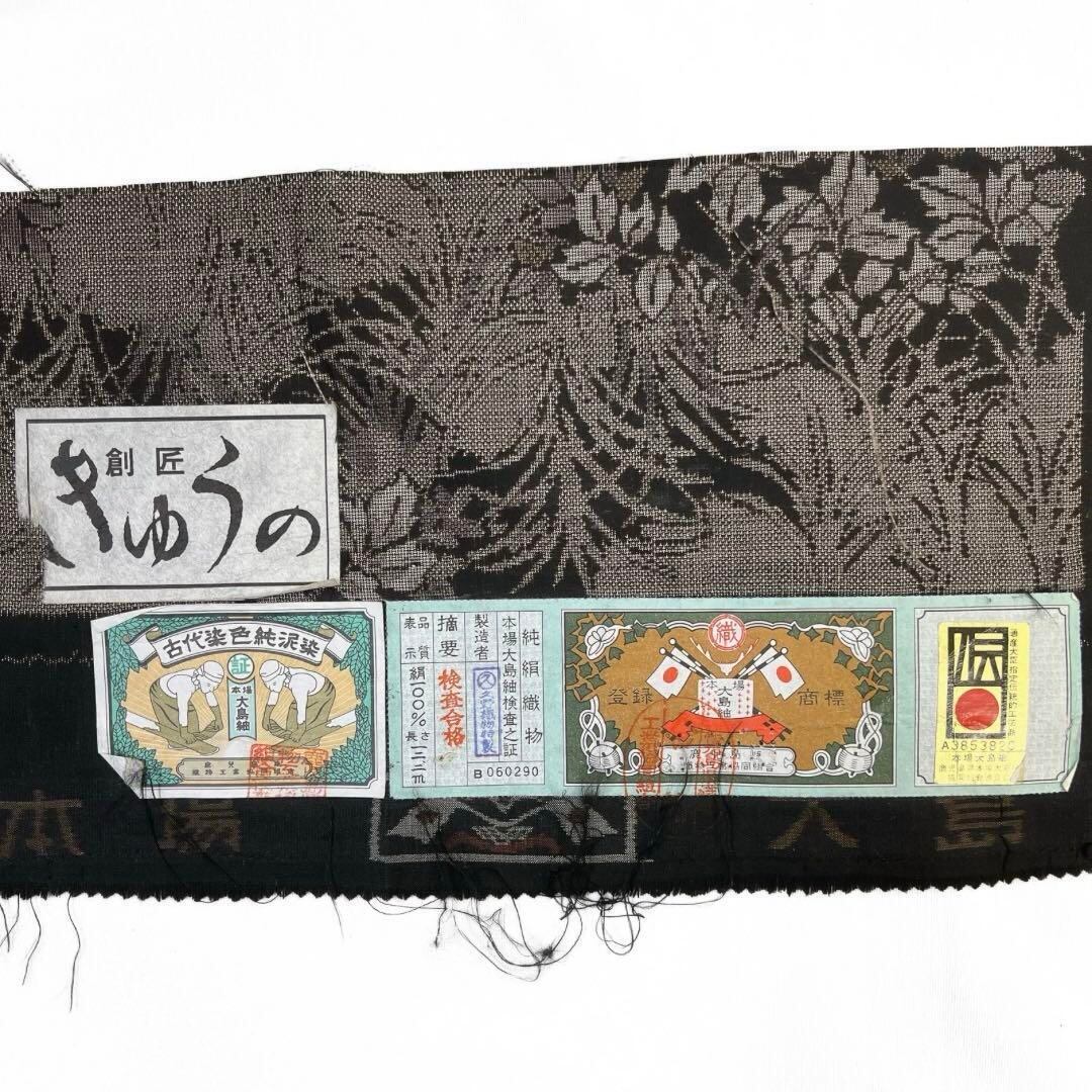 純泥染の大島紬の地に手織りで細やかに織られたリーフの文様がお洒落なデザインの一着です。
