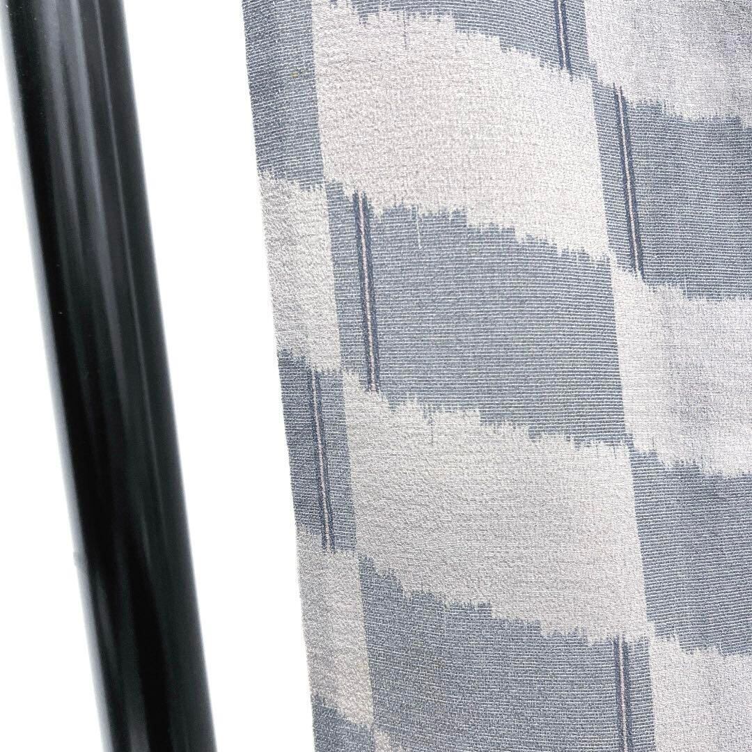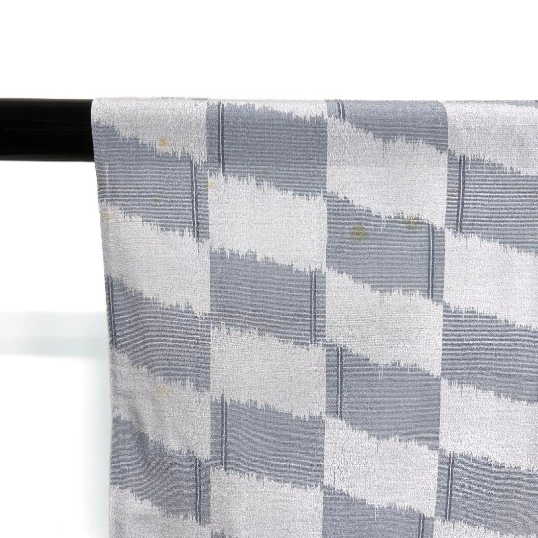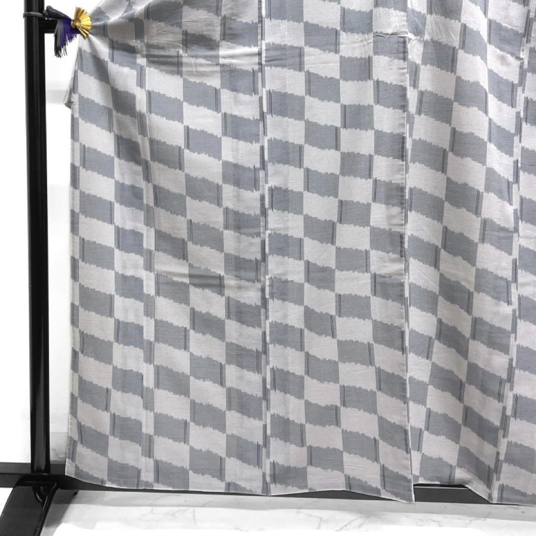 グレーの紗紬の地に織られた斜めのモノトーンの市松文様とネイビーとピンクの縦縞の文様が織られたお洒落なデザインの一着です。
