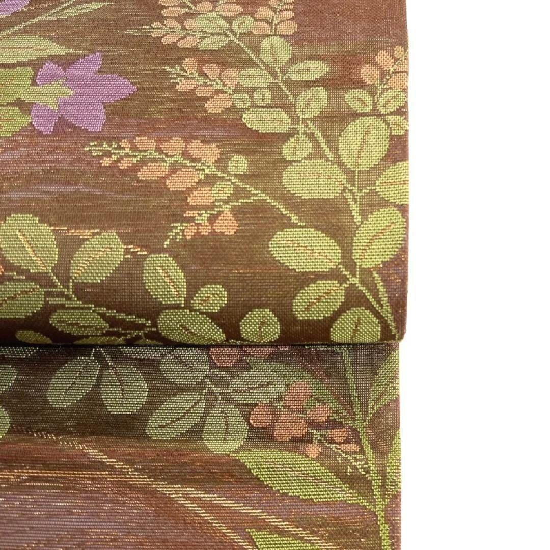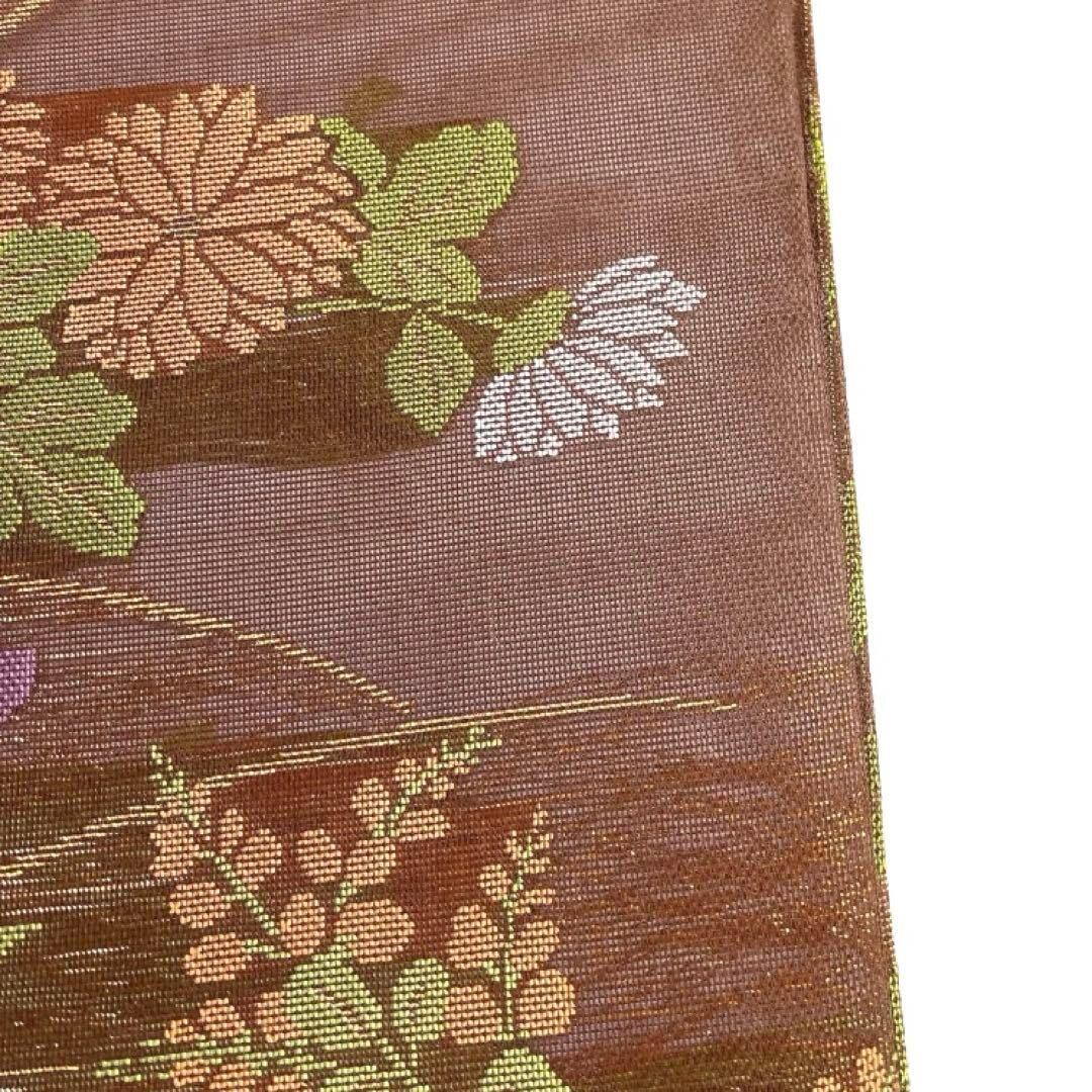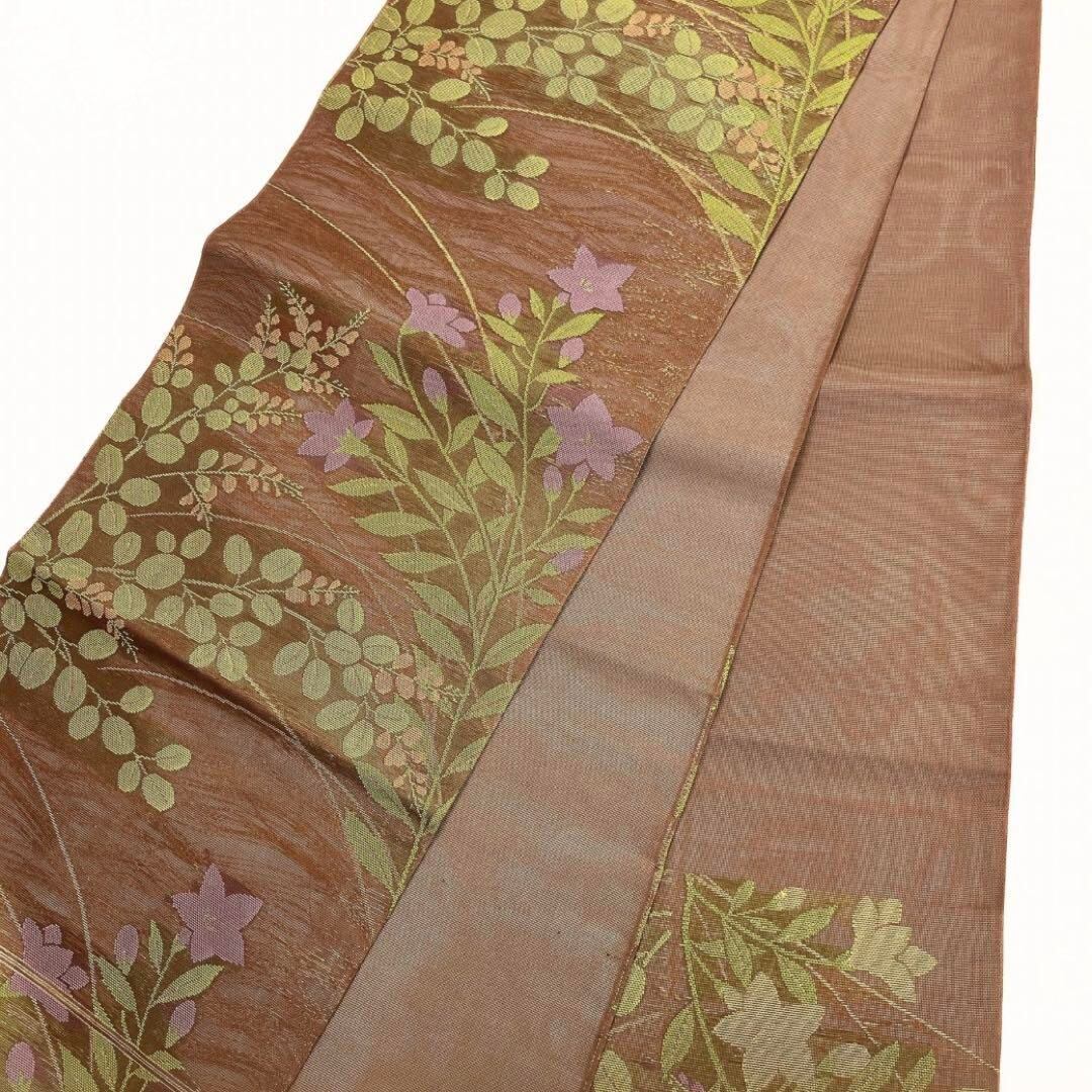 深いブラウンの紗の地に映える萩と菊に桔梗の文様が織られた華やかなデザインの一着です。