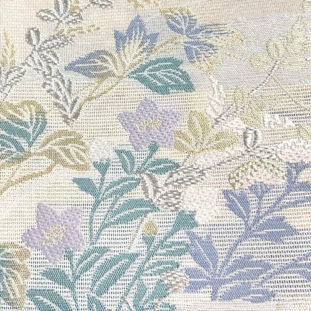 白の紗の地に淡いお色味で描かれた牡丹や菊、桔梗の花模様が織られた華やかなデザインの一着です。