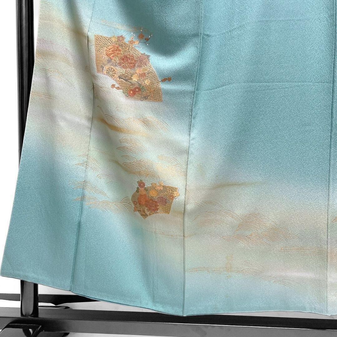 霞が金彩であしらわれ、扇、牡丹がスワトウ刺繍でデザインされた1着です。