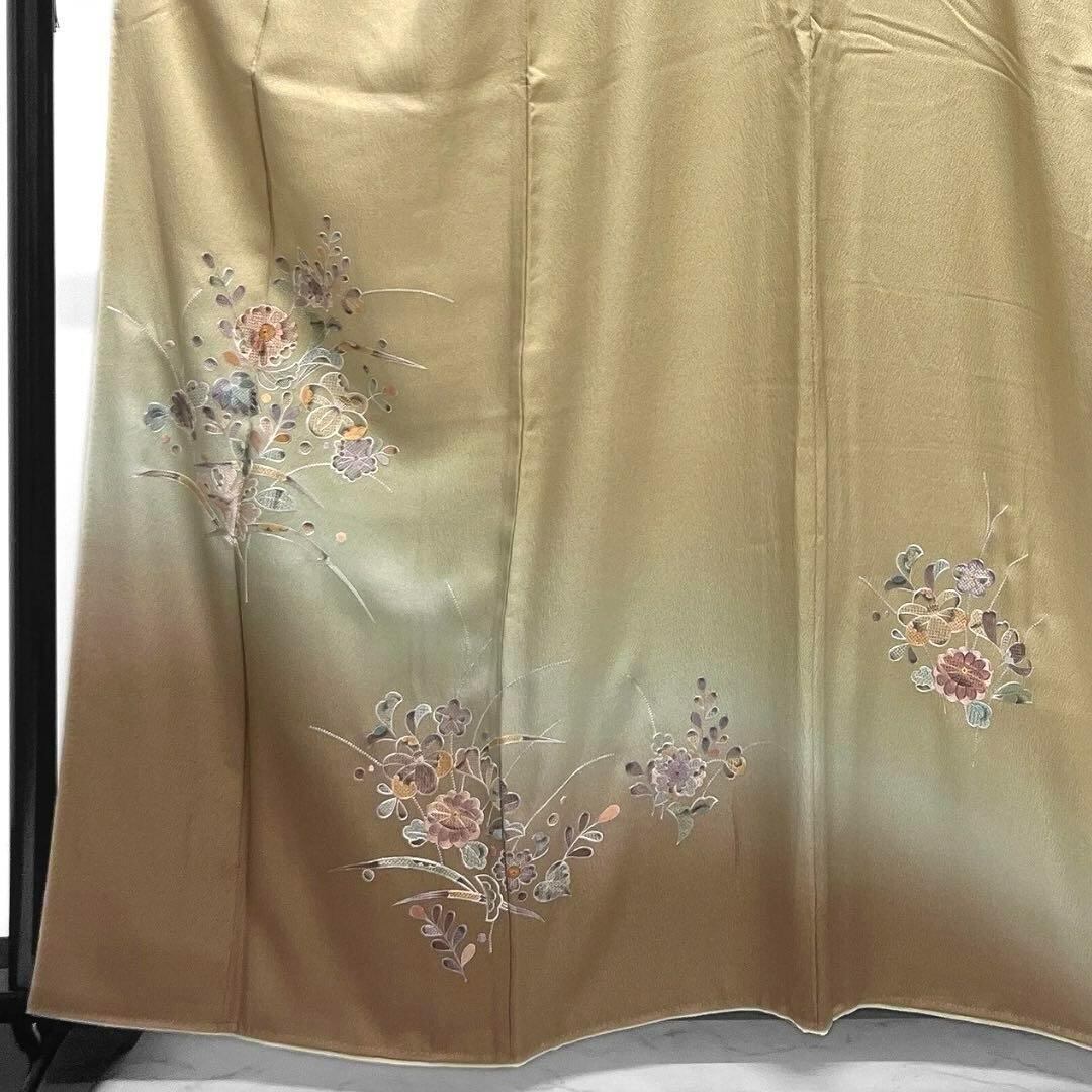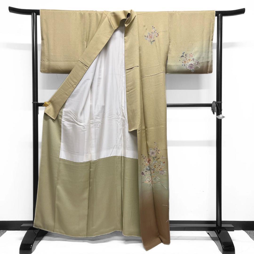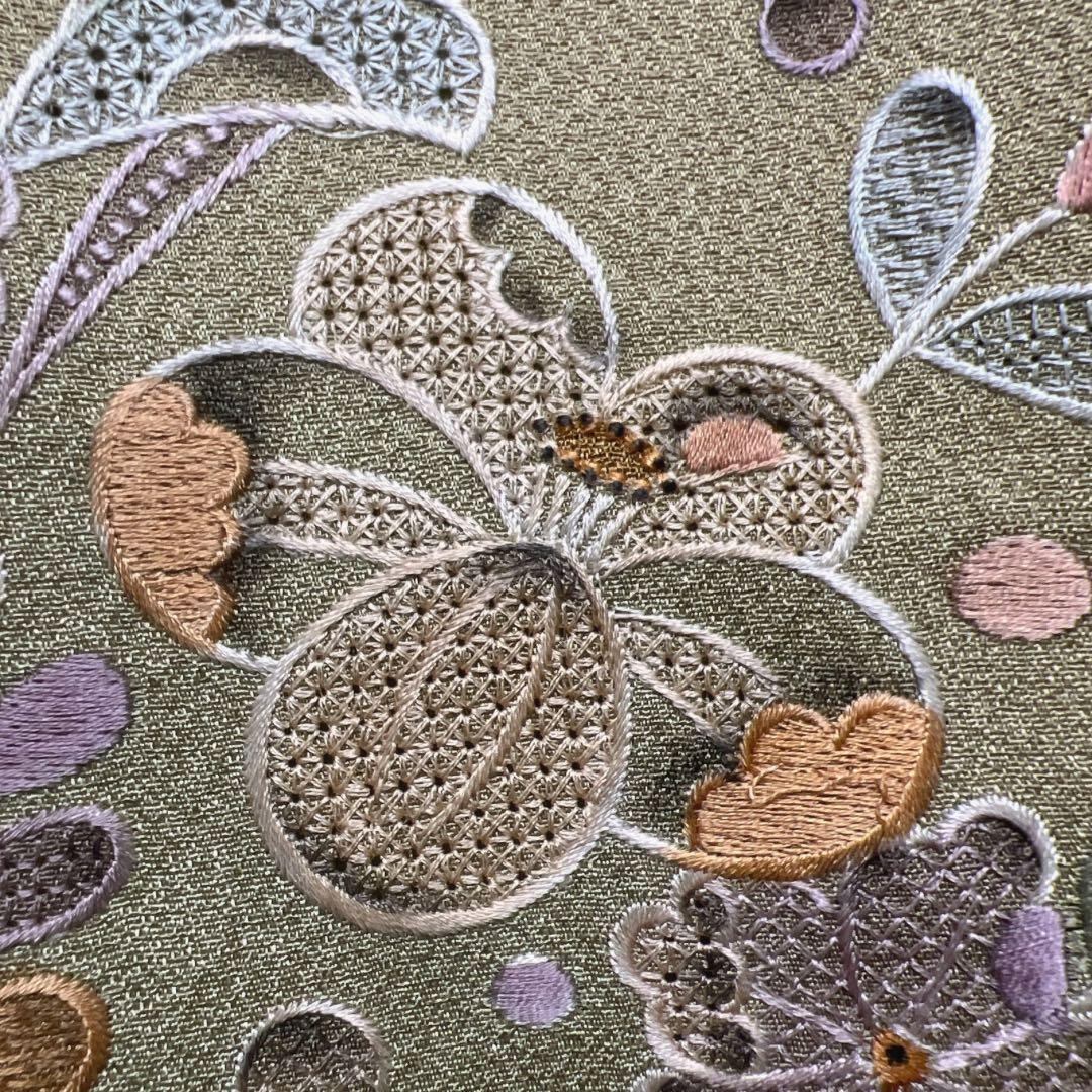 くすみベージュの地に刺繍とスワトウ刺繍で織られた菊や椿、梅や萩の文様が華やかな雰囲気の一着です。