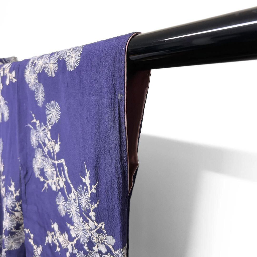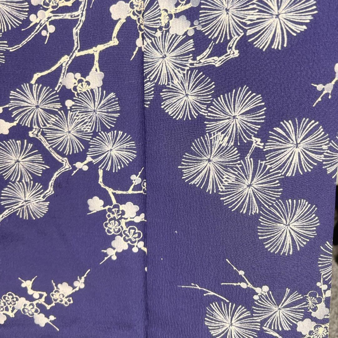 紫のかかったくすみブルー地に白で描かれた松と梅花模様がお洒落な一着です。