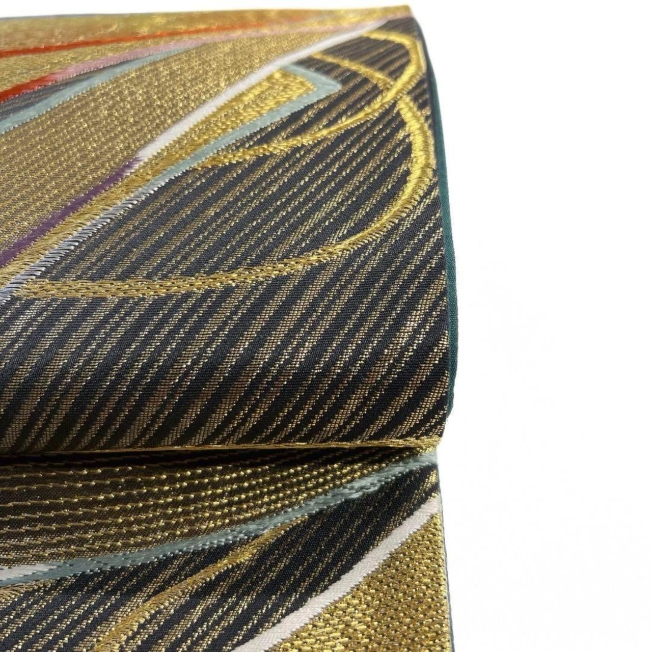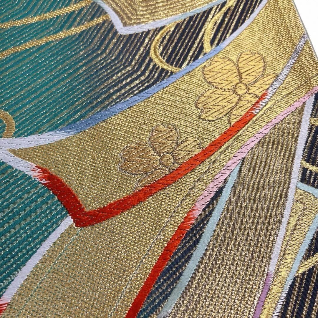 グリーンと黒のグラデーション地に縞模様と熨斗に水引、桜が織られた華やかなデザインの一着です。