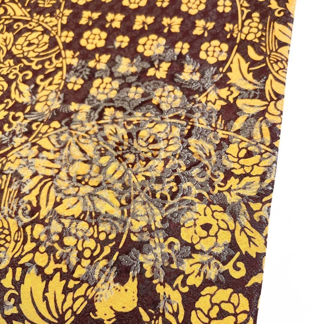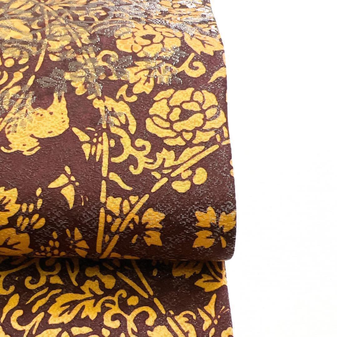 深いブラウンの銀通し地にイエローで描かれた鳥や山羊に様々な花模様がお洒落なデザインの一着です。