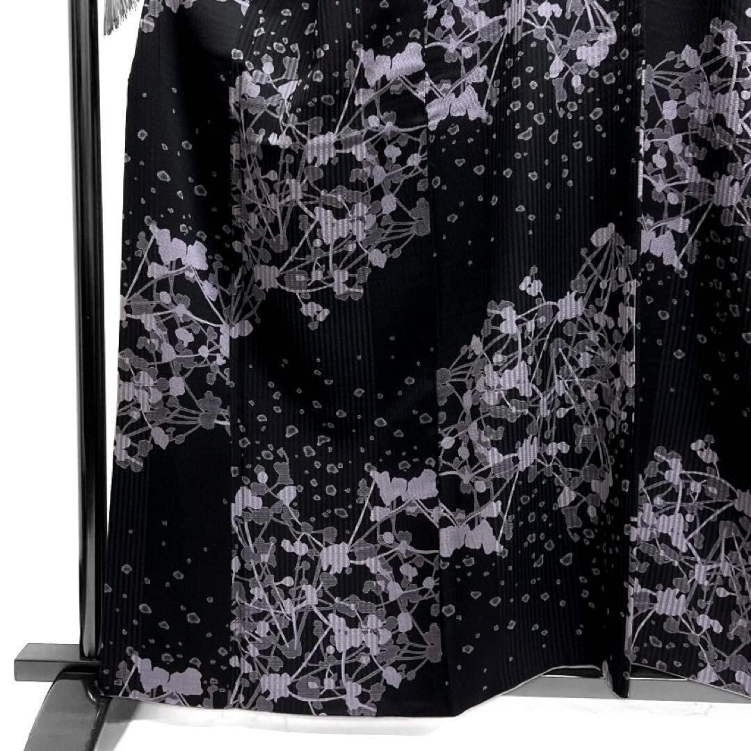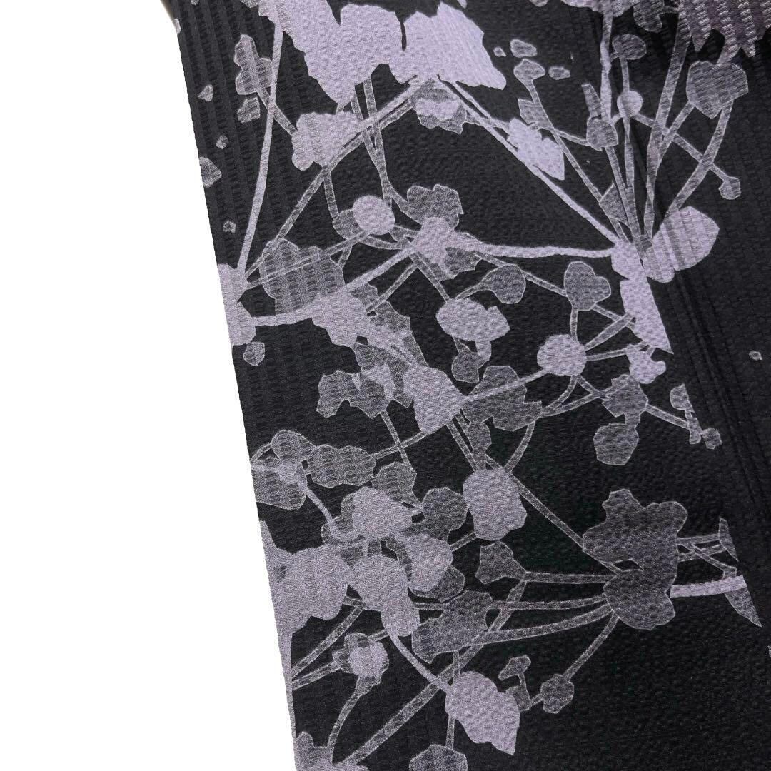 凹凸感のある縦縞と変わり横縞の地紋にくすみパープルの葉影のような抽象模様が目を惹く粋でお洒落なデザインです。