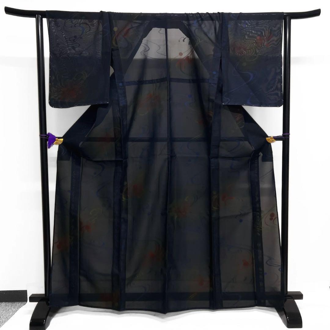 黒の表地にブルー、グリーン、オレンジのグラデーションのカラフルな裏地による二重紗で織られた流水にドットの文様が目を惹くお洒落な雰囲気の一着です。