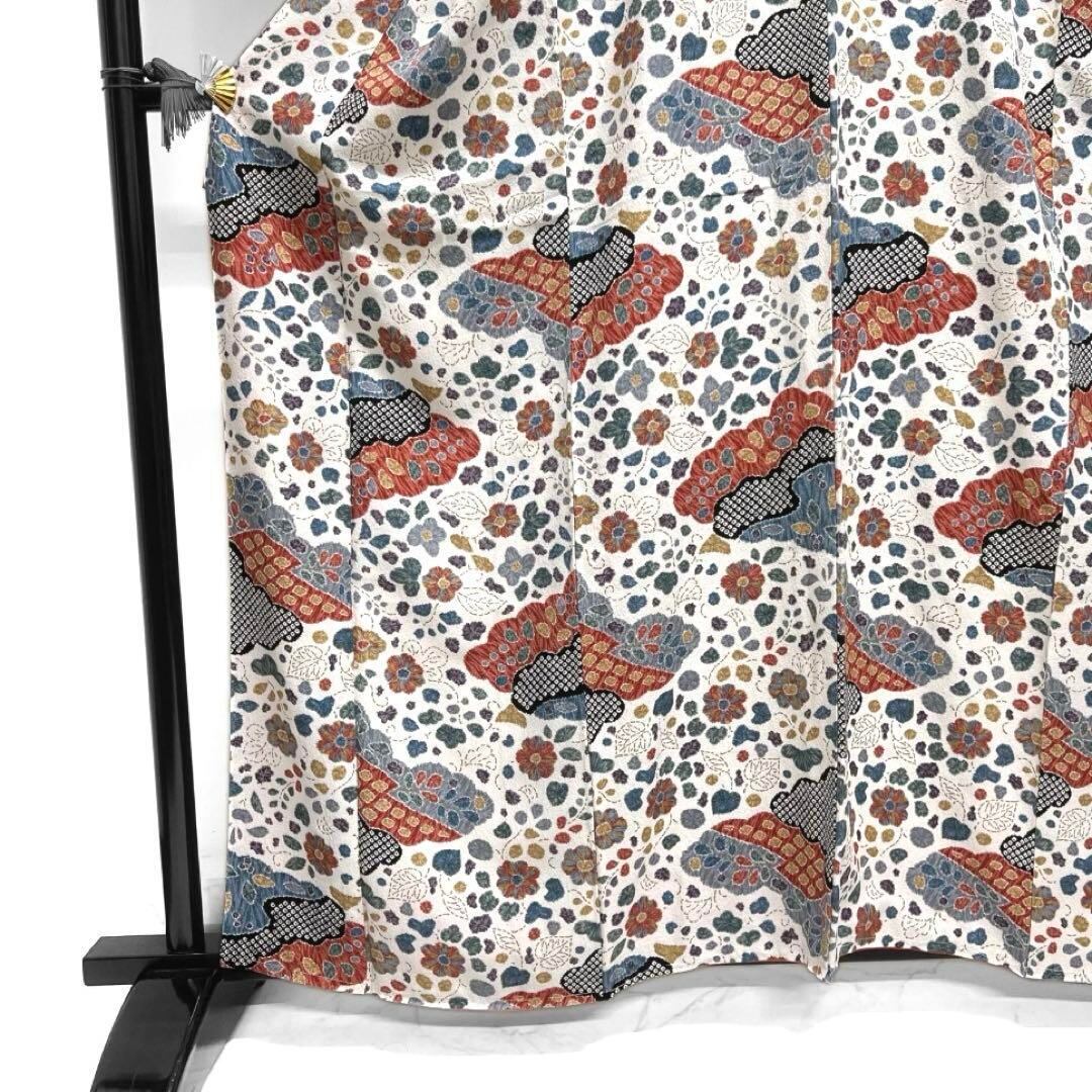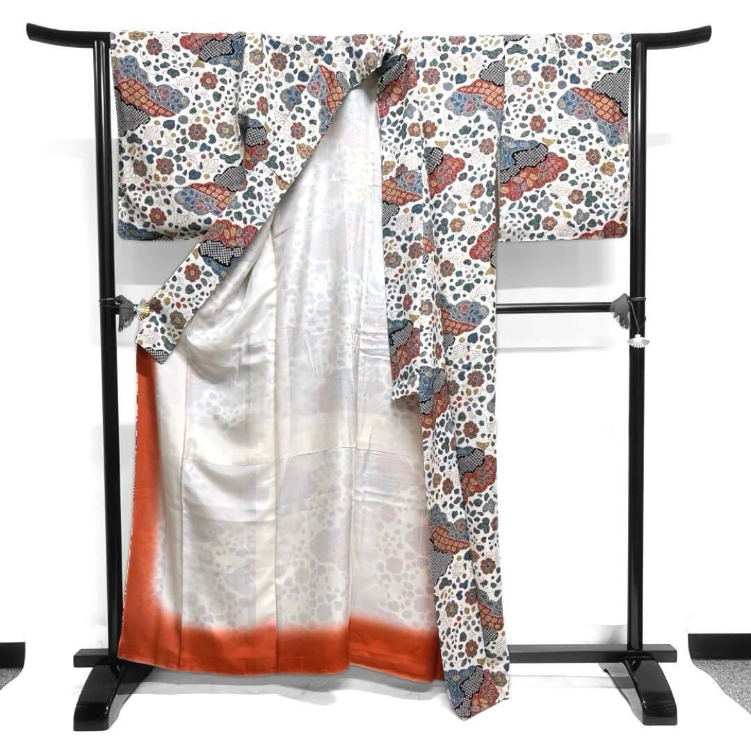 白地に絞り調で描かれた金彩に花模様や雲と松皮菱、鹿の子の文様がカラフルで見ていて飽きのこないお洒落なデザインの一着です。