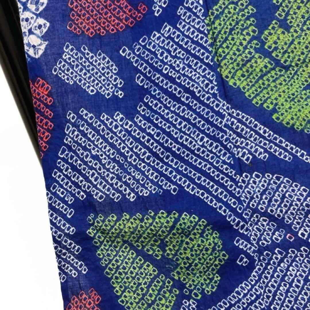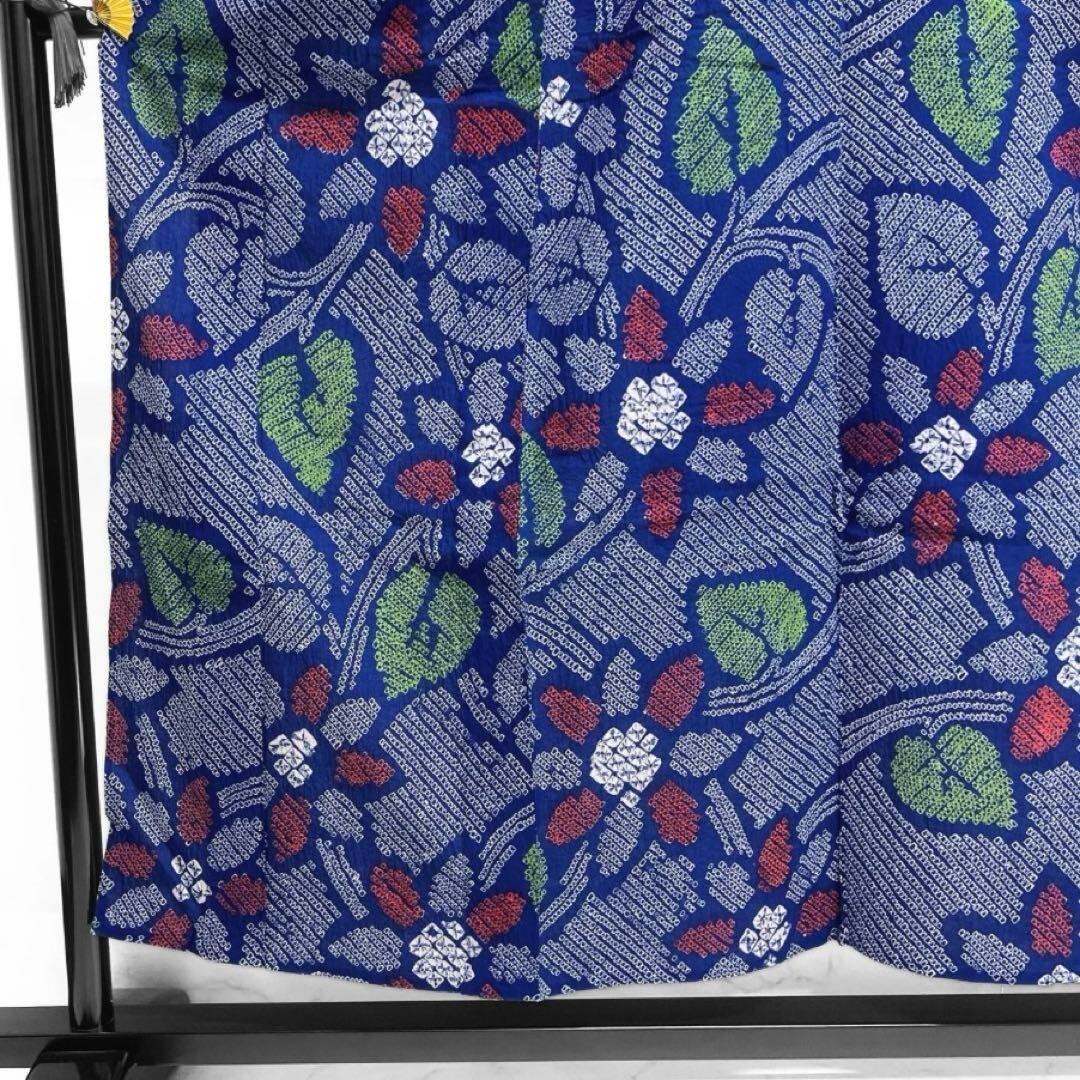 鮮やかなブルーの地に細やかな有松鳴海絞りで描かれた花模様にグリーンのリーフが目を惹くお洒落なデザインの一着です。