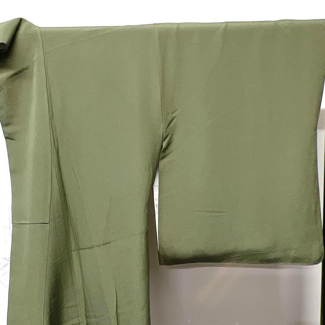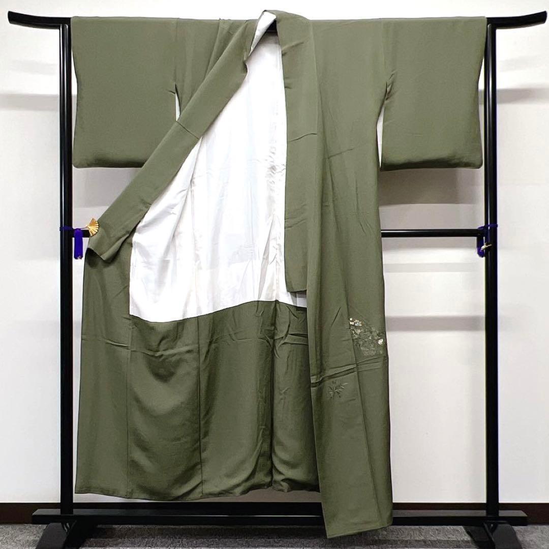 深いグリーン地に刺繍と螺鈿細工を交えて織られた花籠の模様がお洒落な一着です。