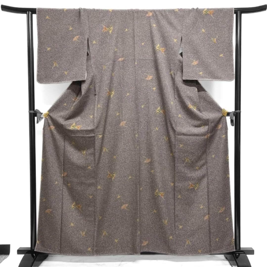 紬のたたき染地に描かれた銀杏に鹿の子や菊、梅の文様がお洒落なデザインの一着です。、