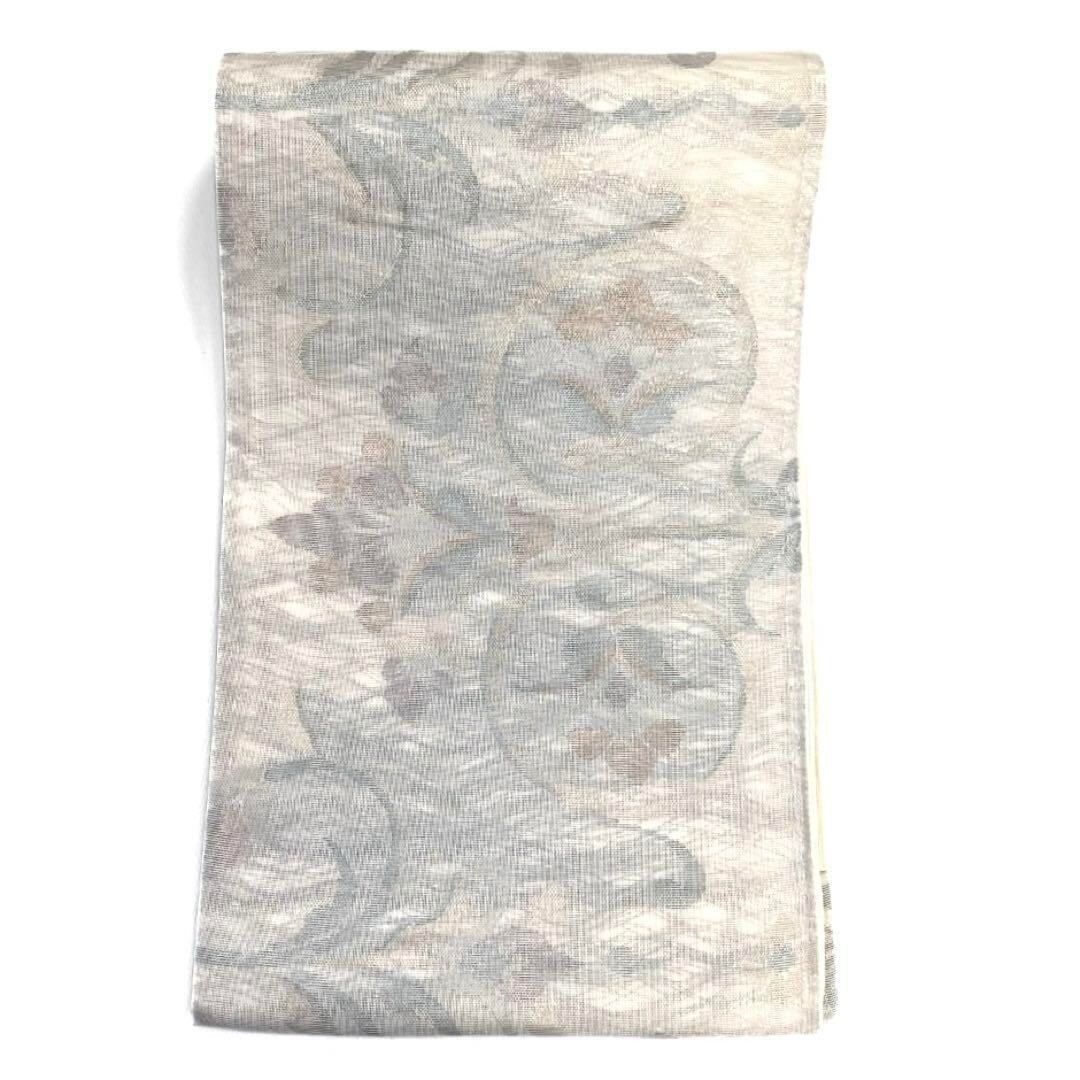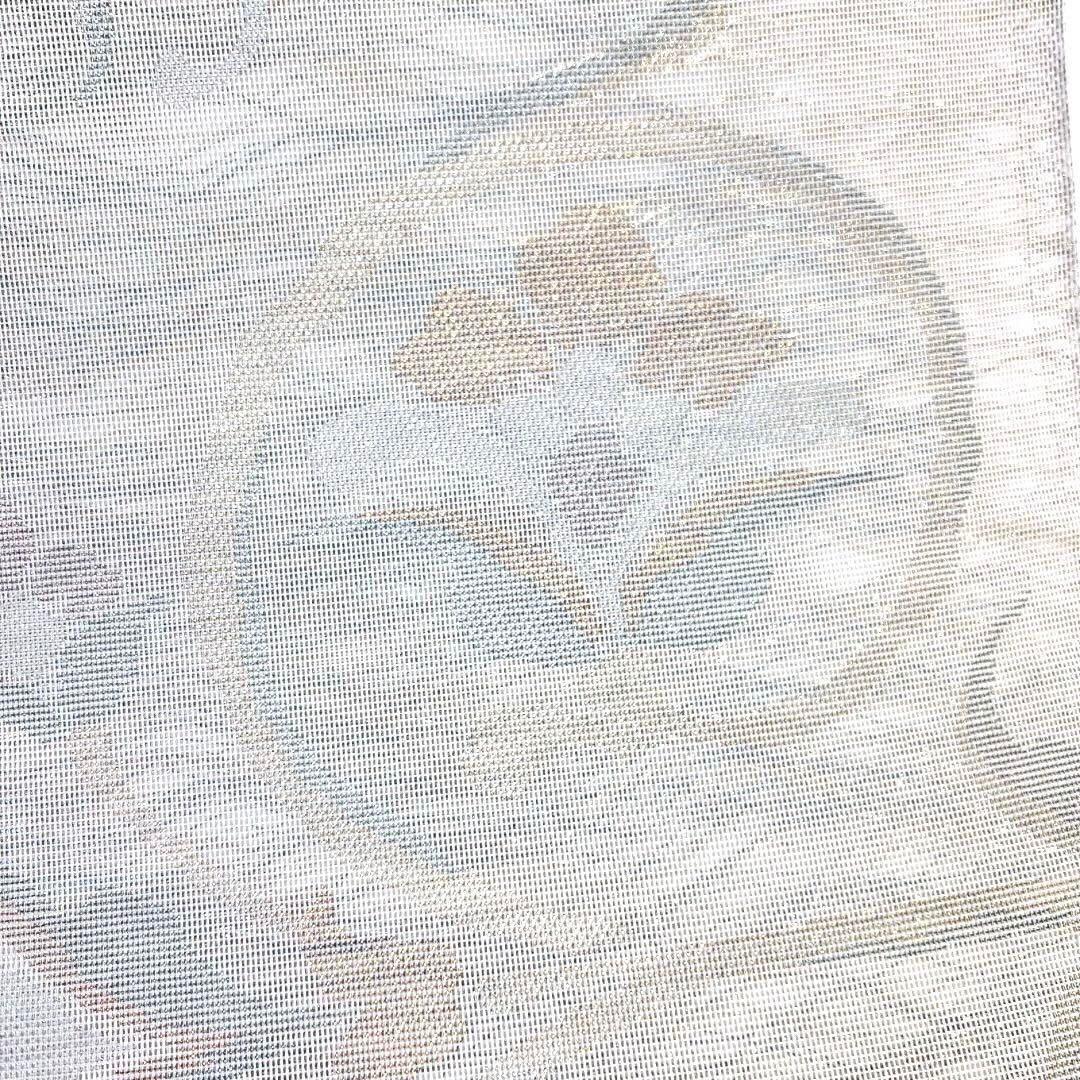 白に掬いの地にゴールドやブロンズカラー光沢のあるパープルやブルーで織られた唐花の文様が煌びやかでお洒落なデザインの一着です。