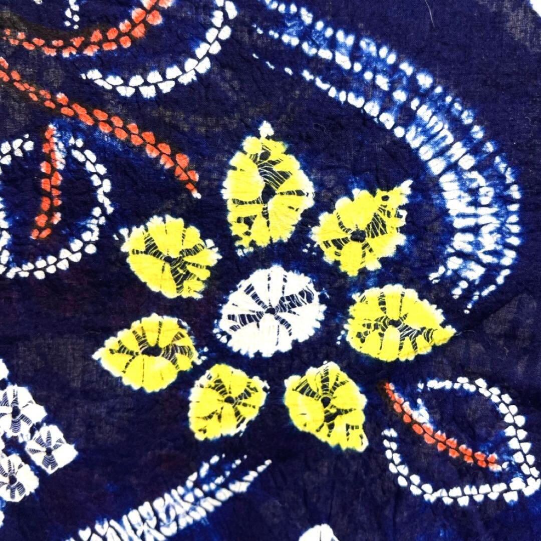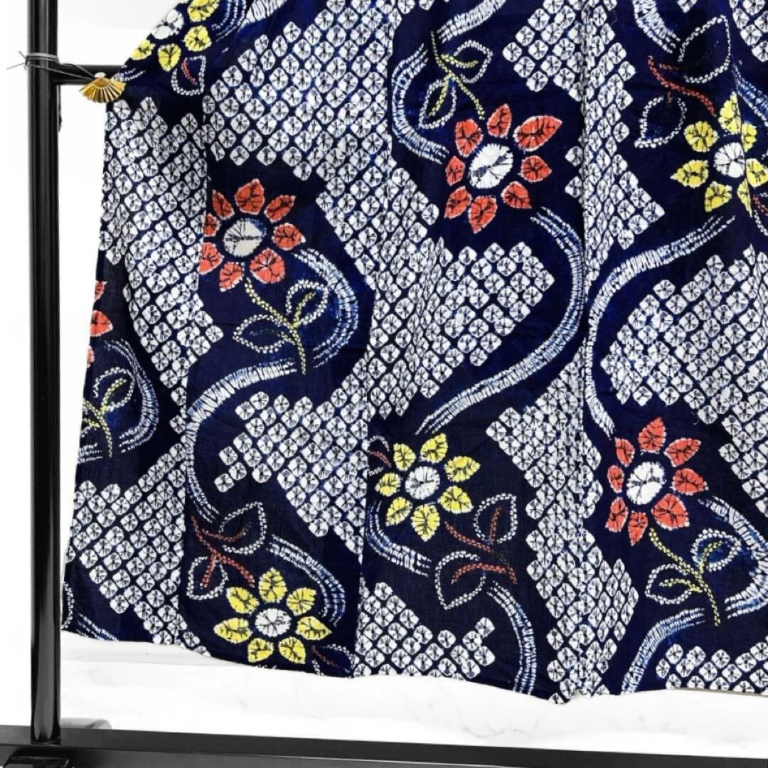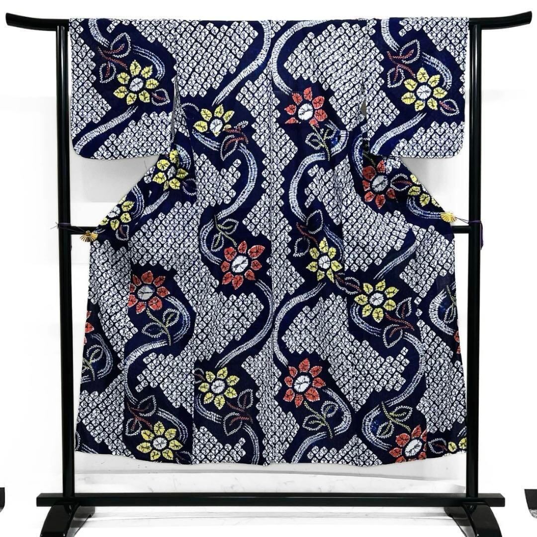 藍染のネイビーの地に有松鳴海絞りで描かれた流水に花模様がお洒落なデザインの一着です。