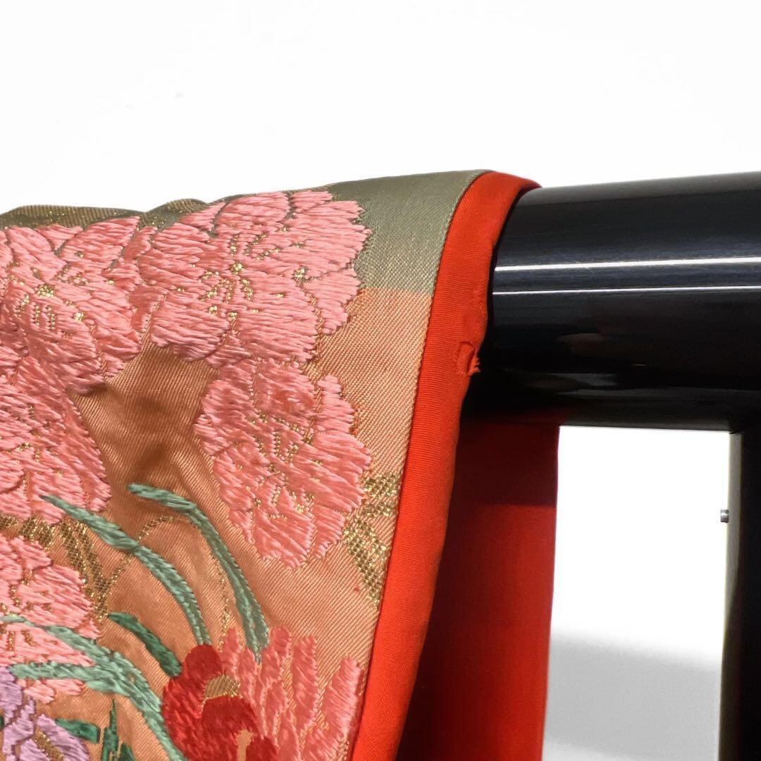 くすみカラーのグリーンやオレンジ、ブラウンの地に唐織で織られた花車に菊や牡丹、桜、椿、藤の文様が華やかなデザインの一着です。