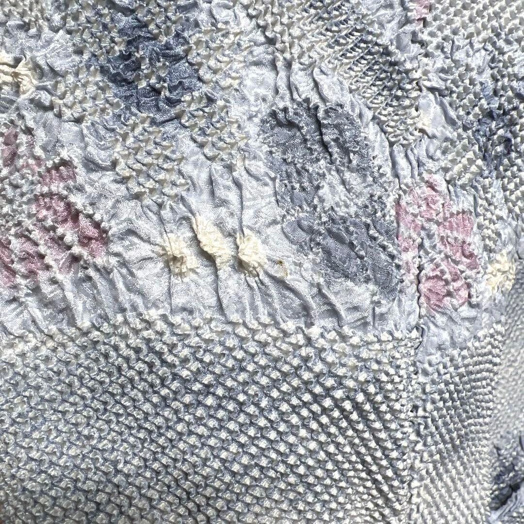 くすんだライトブルーの地に総絞りで描かれた菊や楓、松の文様がお洒落なデザインの一着です。
