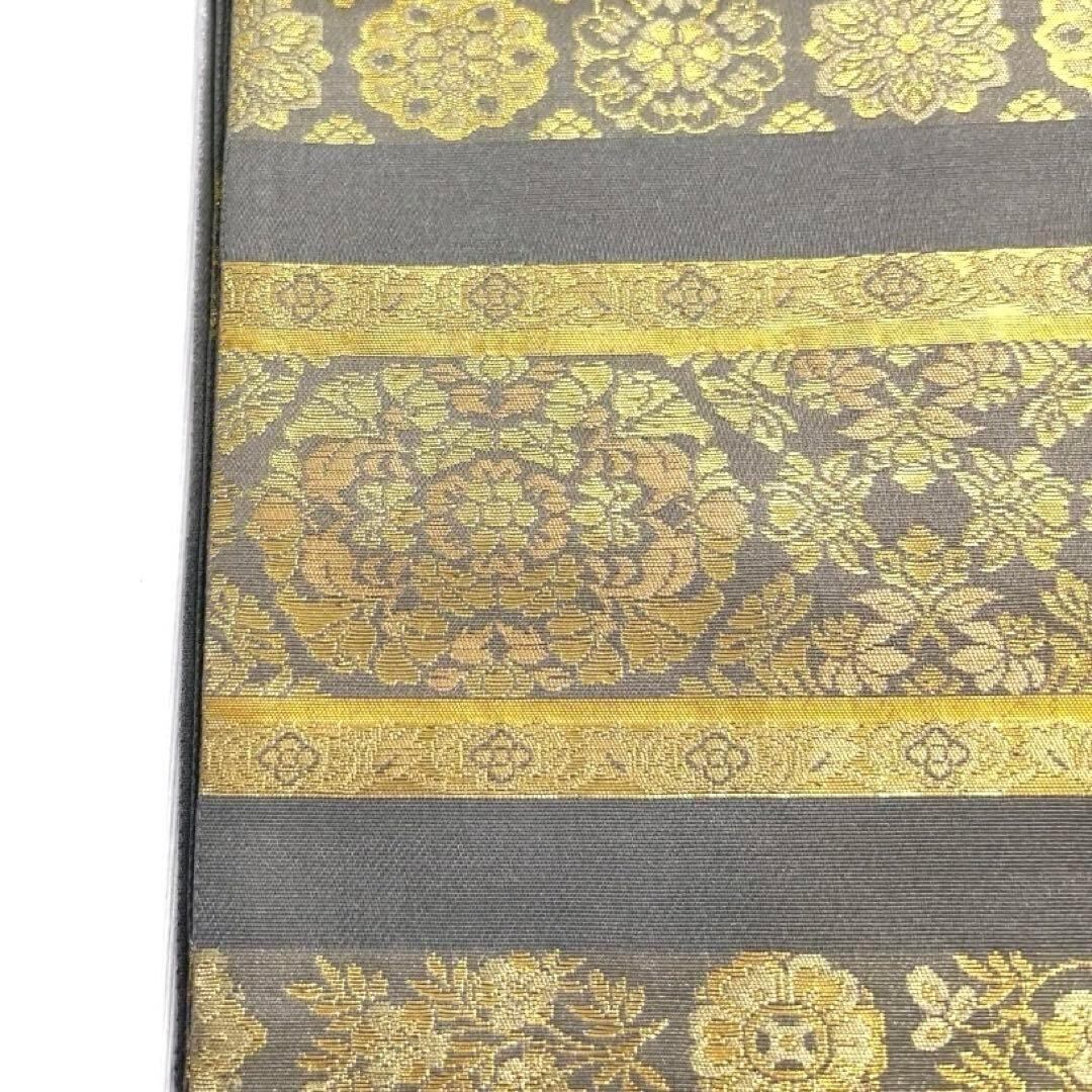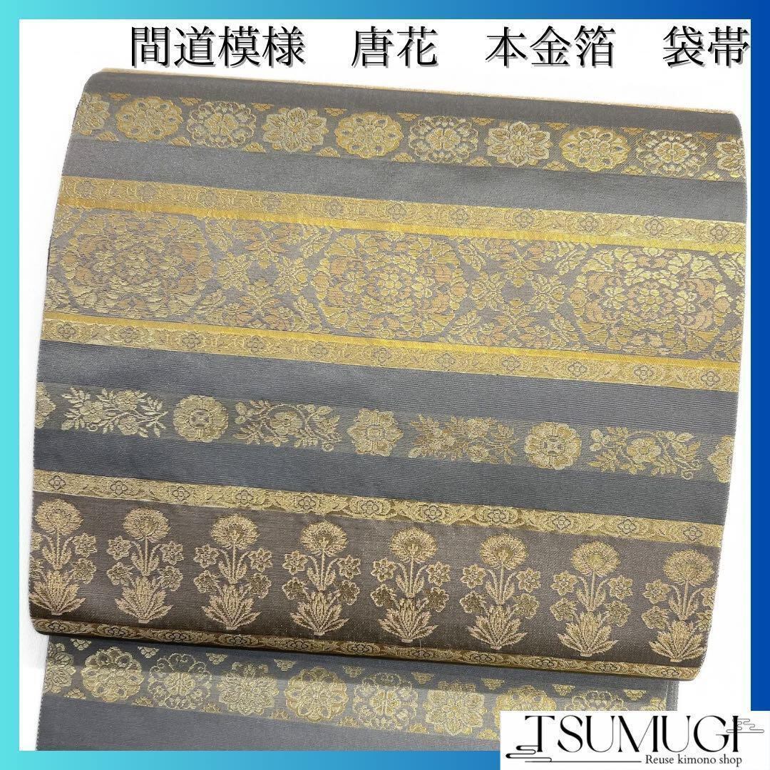 草木染のグレーの地に本金箔の間道模様に唐花や花紋が織られた華やかなデザインの一着です。