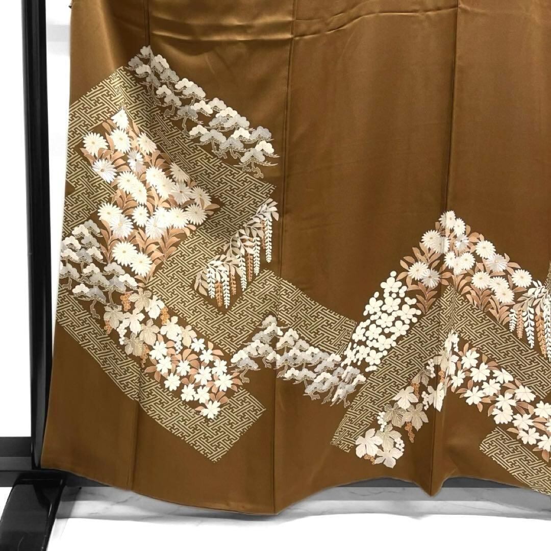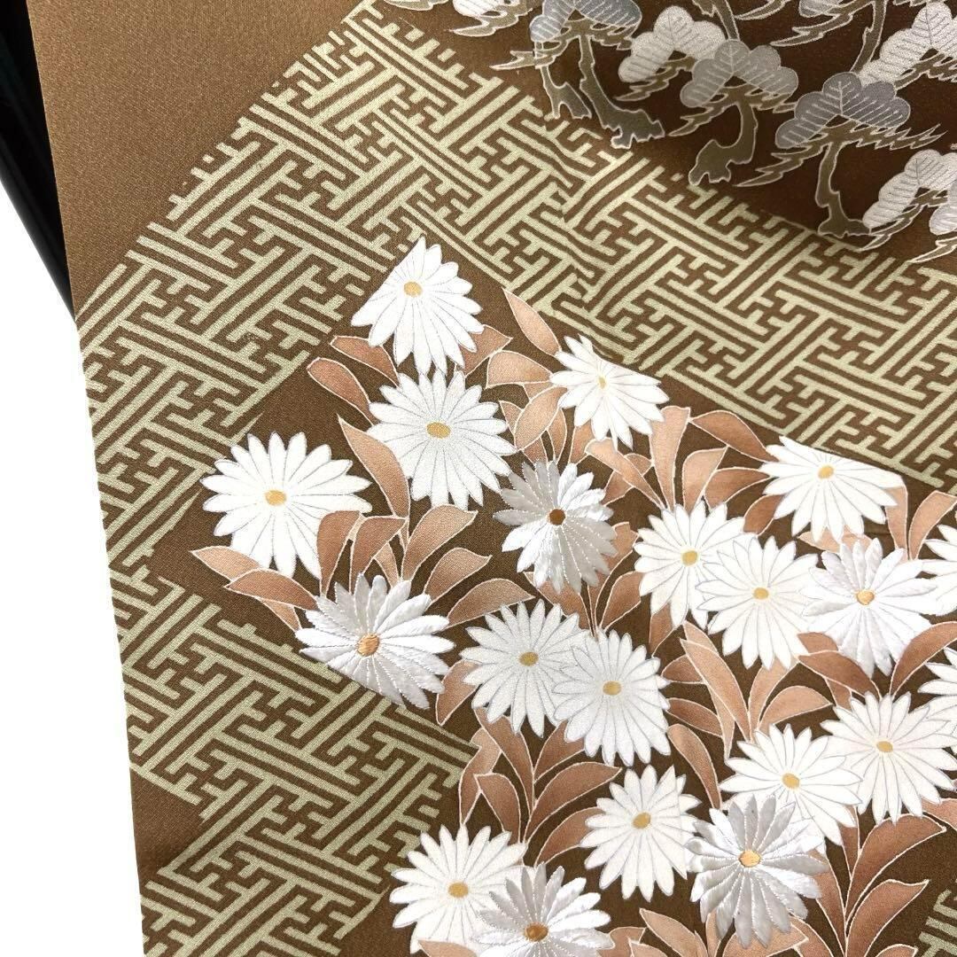 ブラウンの地に紗綾形と刺繍の菊に葡萄、松、藤の花が描かれた華やかな一着です。
