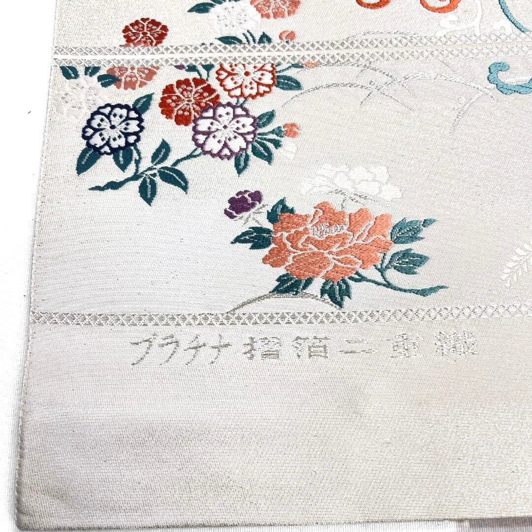 プラチナ摺箔二重織で織られた白地に鮮やかな鳳凰の文様と様々な花模様がカラフルに織られた華やかな一着です。