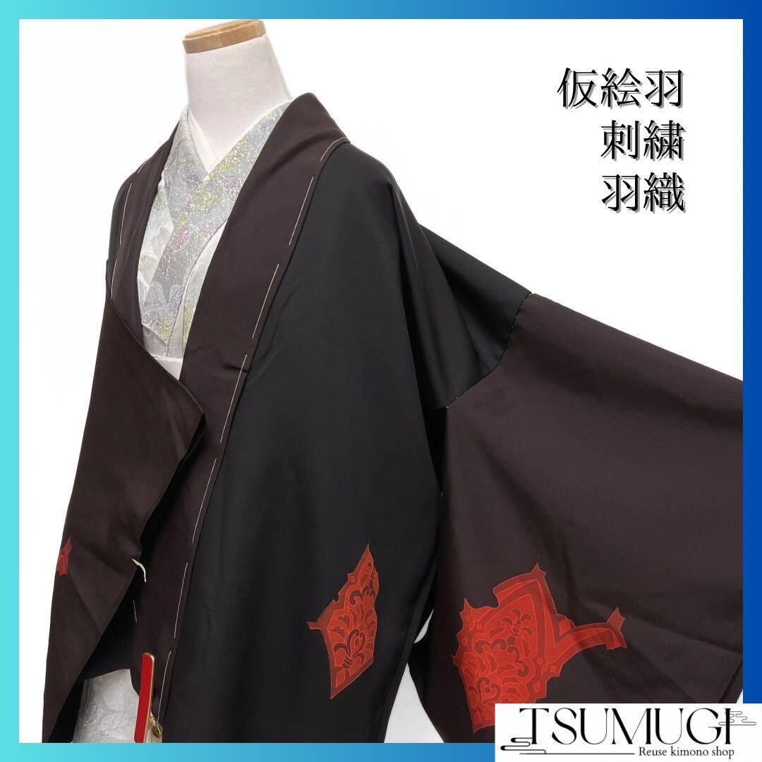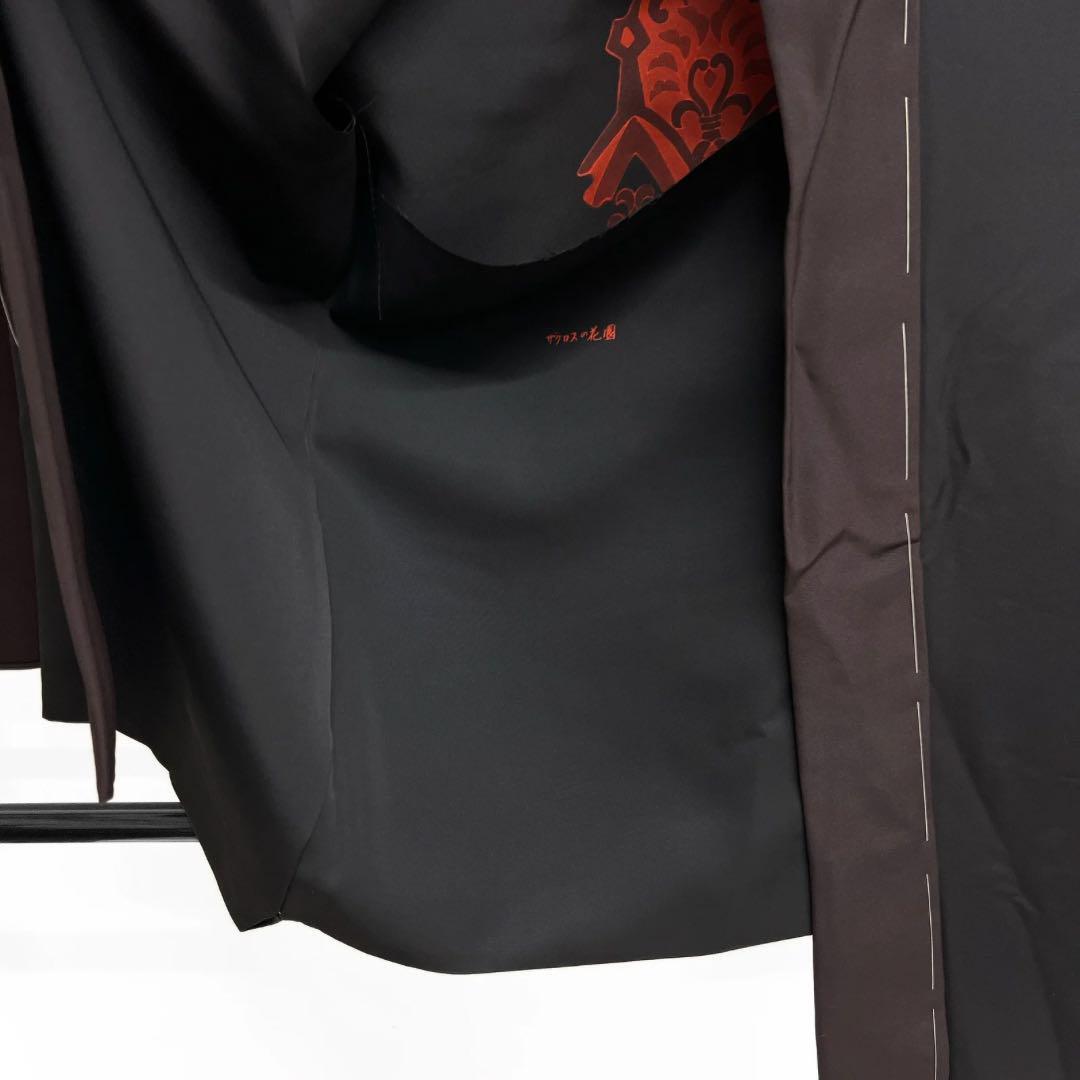 刺繍を交えた抽象的な更紗文様と胴の黒地に袖と襟が深いくすみのワインレッドが珍しいお洒落なデザインです。