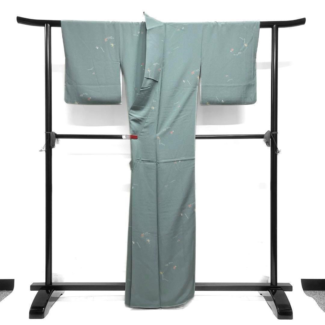 青みのあるグリーンの地に松葉による松竹梅と菊の吹き寄せ文様がお洒落なデザインの一着です。