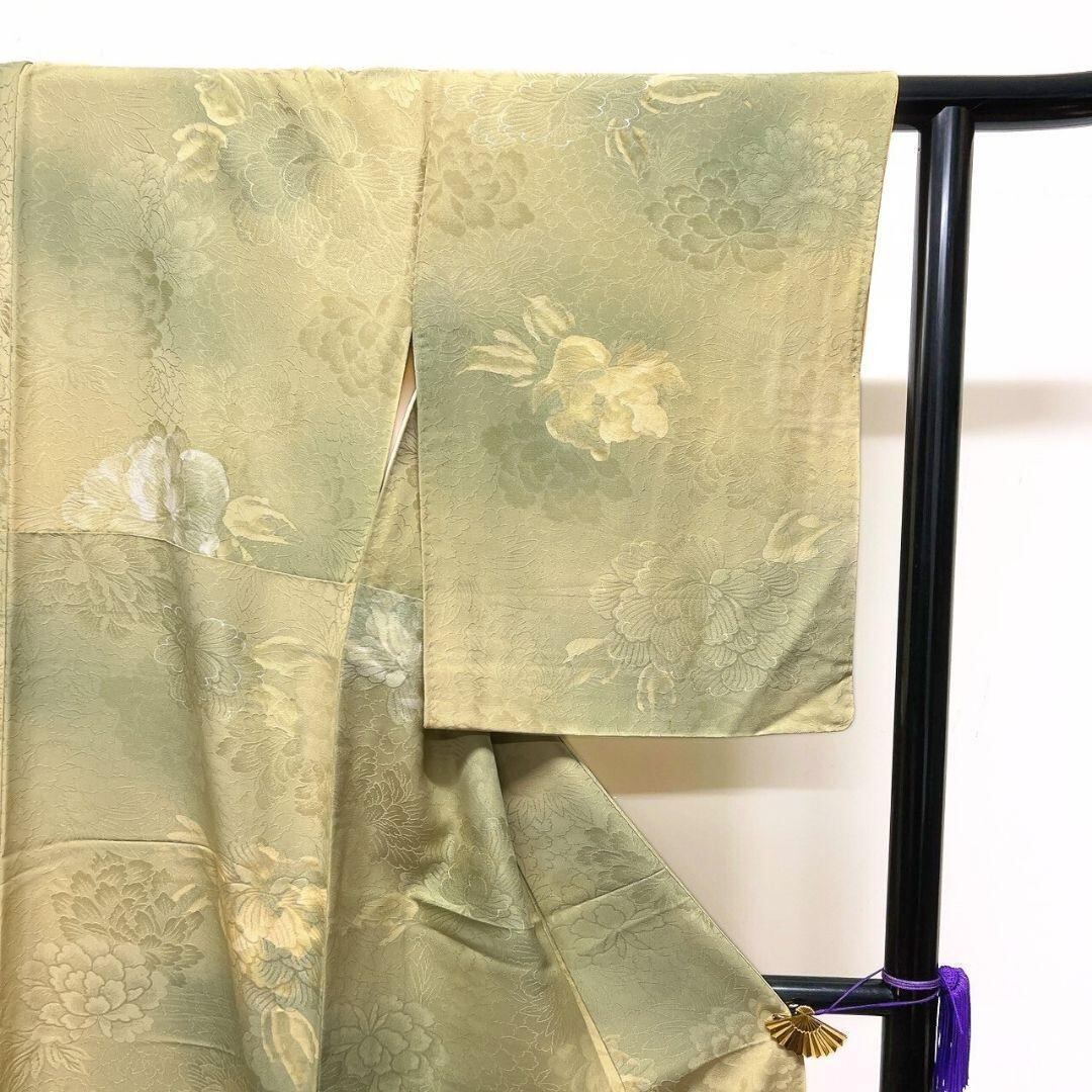 黄色と黄緑色のグラデーションに白牡丹が美しいデザインの一着です。