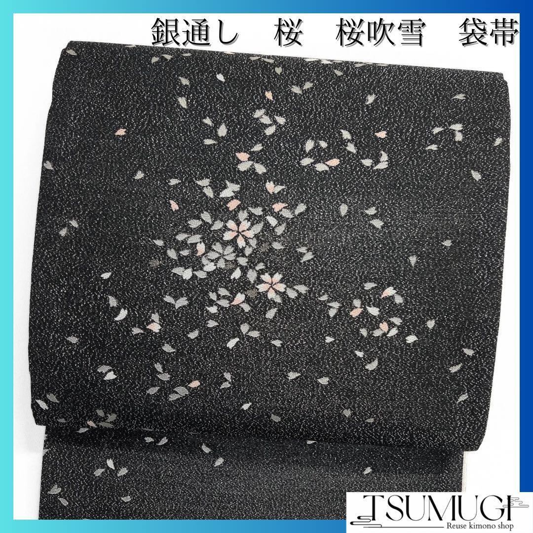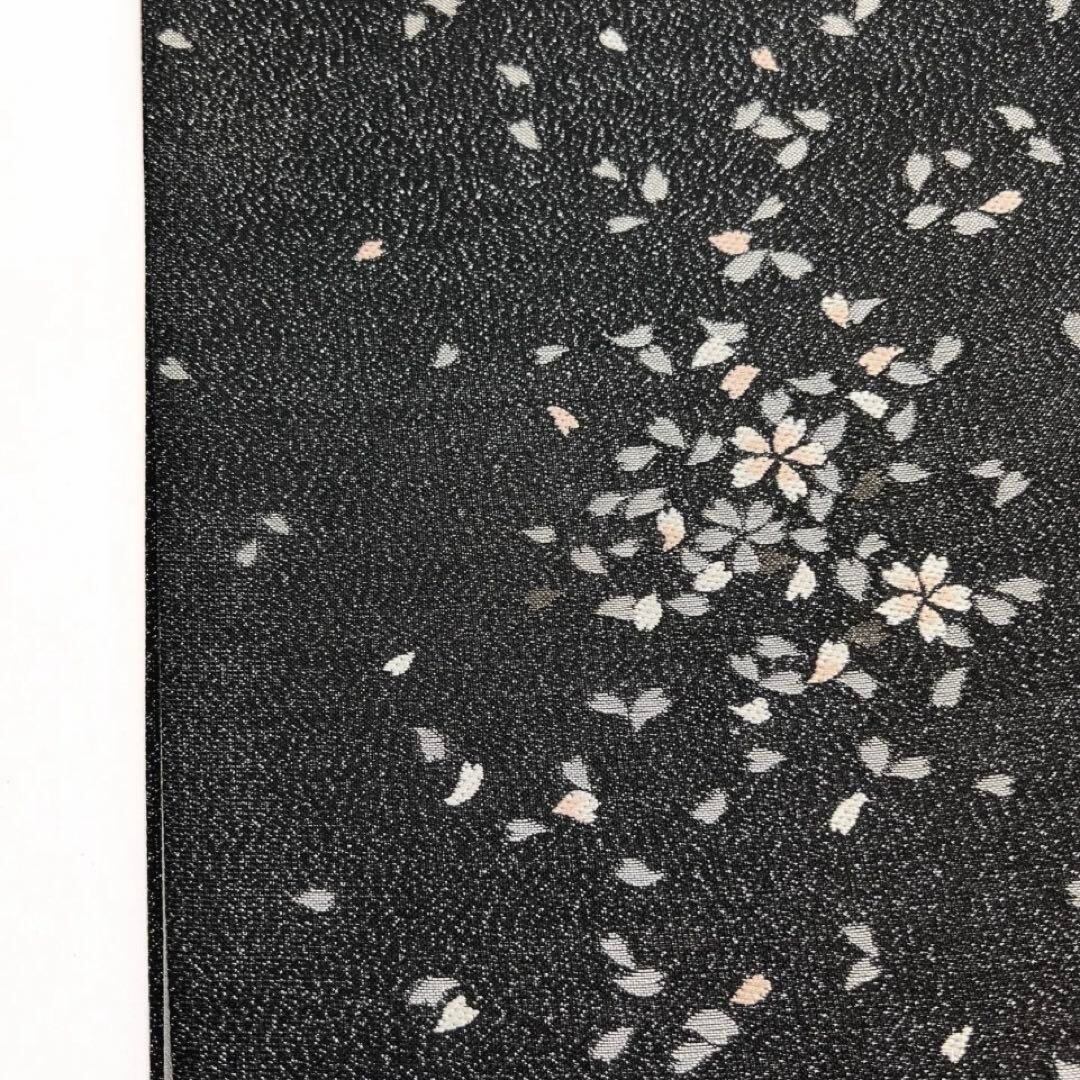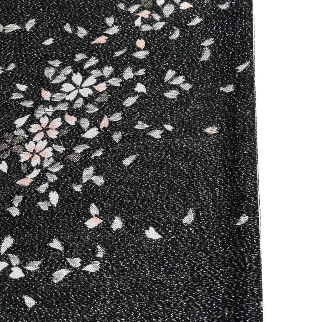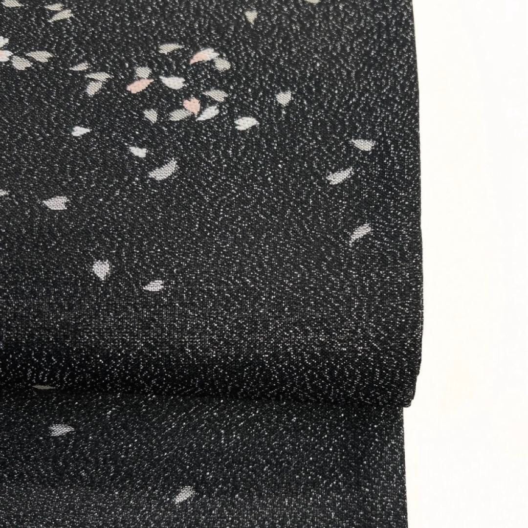 銀通しの黒地に桜と桜の花吹雪の文様が織られた華やかなデザインの一着です。
